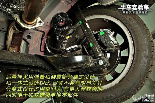 后悬挂采用弹簧和避震筒分离式设计,也是目前的一个趋势,实际上和一体式设计相比,驾驶起来不会有明显差异。分离式设计占用空间大,可以有更大的调教空间,同时便于独立维修更换零部件。