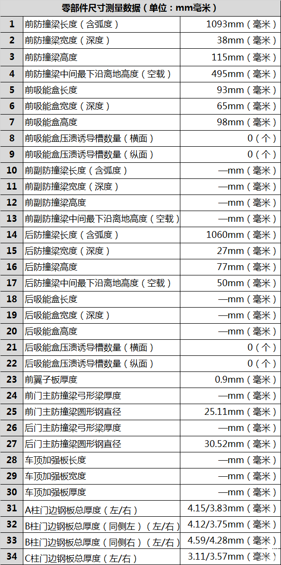 拆解报告分为如下几个单元:前部防护结构、前部翼子板、后部防护结构、发动机舱、前后车门、车内顶棚、车内地板、底盘及悬挂。附录为测量数据和其他信息。