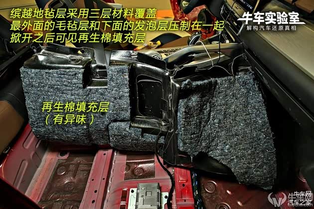缤越地毡层采用三层材料覆盖,最外面的毛毡层和下面的发泡层被压制在一起,掀开之后可见再生棉填充层。再生材质虽然有利于材料的环保再利用,但也给车内带来一定的异味。白车身地板上大规模贴合了沥青止震贴,起到抵御共振的作用,但也是异味的一大来源。