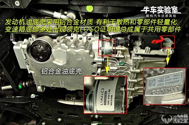 发动机油底壳安装了双层棉质保护罩,变速箱底部多处出现领克LOGO,证明了该总成属于共用零部件。而油底壳采用铝合金材质,有利于散热和零部件轻量化。