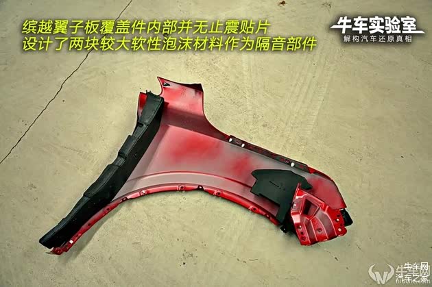 缤越翼子板覆盖件内部并无止震贴片,但设计了两块较大的软性泡沫材料作为隔音部件。