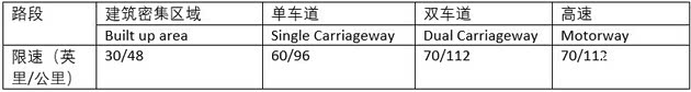 另一个英国特色是National speed limit国家限速规则。英国作为一个面积不大的国家,在全国实行统一的限速标准。对小型车而言,分别有以下限速: