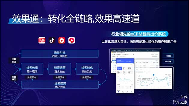 如何提升潜客转化力?简单回顾下“效果通”的产品。它能够为汽车客户提供线索收集、运营、转化到回溯全链路一站式服务。效果通开放了头条、抖音、西瓜、火山四端公域流量,利用多样式信息流点位连接海量潜客,并采用oCPM系统,基于转化目标优化,向最有转化意向的用户展示广告。智能出价系统配合智能创意、诊断工具、线索过滤等,降本增效的同时,更促进营销由“高效”向“有效”的转化进阶。