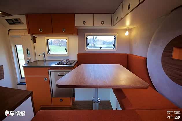 车厢内布置了坚固层压板(HPL)表面的轻质建筑板材家具,家具面板带有真胡桃木贴面,配有黄铜配件和不锈钢锁具,做工质感相当不错。车尾区域的环形沙发被备胎区域占据了一些空间,可以乘坐3-4人。将升降餐桌降低后能够拼床,尺寸为:1900*1350mm,满足两人睡卧。