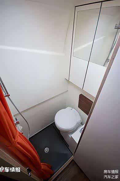 车内厨房区域布置的比较紧凑,操作台布置了带盖水槽、双芯燃气灶和50L车载冰箱,制作一些简餐基本够用。对侧位置是本车的储物柜和卫浴间,卫浴间配备淋浴系统、带镜子的储物柜、旋转式马桶和隔水浴帘,与室外的柜子很有意思,设计了滑轨方便拿取黑水箱,还可以当作和前部驾驶舱贯通的台阶。