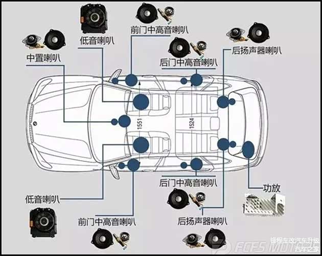 哈曼卡顿全套音响示意图,哈曼卡顿16件套音响,包括7个高音喇叭、7个中音喇叭,2个低音喇叭+L7功放,极大提高了车内音频系统,令车内乘客享受到多方位完美的听觉效果,这就是车主需要的最好方案,追求音质音效从不将就,每一个真实的震撼感都能激起内心的共鸣。