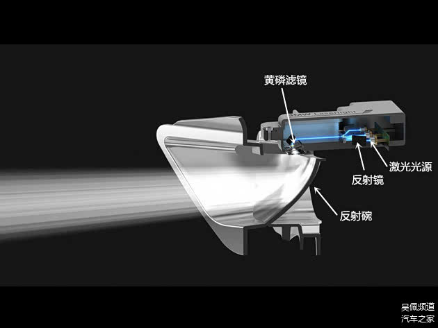 i8车型上的激光大灯由激光光源、反射镜、黄磷滤镜和反射碗四个部分组成,三束由激光二极管发射的激光经过反射镜的反射聚焦在黄磷滤镜上产生白光,然后通过反射碗从大灯射出,从而达到照明的目的。