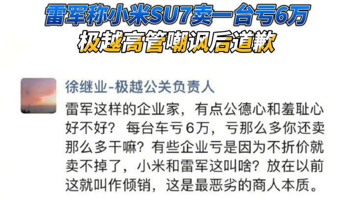 车快评雷军称小米SU7卖一台亏6万 极越高管嘲讽后道歉