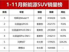 购车网官网1-11月新能源SUV销量揭晓!问界M7第五,理想L6第六,特斯拉夺冠