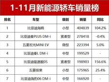 购车网官网1-11月新能源轿车销量榜!比亚迪、五菱包揽前8,小米SU7第15