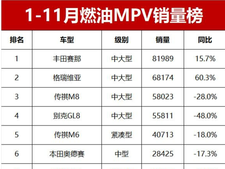 购车网官网1-11月燃油MPV销量排名!别克GL8腰斩,丰田MPV夺冠亚军