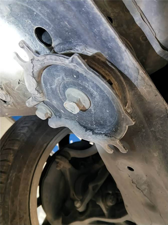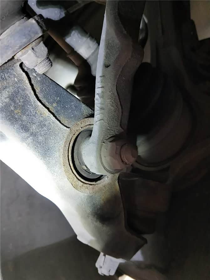 这是下支臂固定减震器连接处的胶套有点裂纹,胶皮玩意风吹雨打日晒的都会老化,时间长了都会出现这种情况,不会影响到行驶安全,暂无无需留意。
