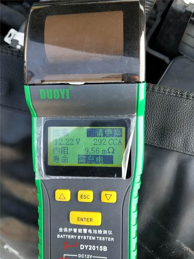 根据电瓶测试仪检测,电瓶电压低于12.50V未达到标准状态。冬季蓄电池蓄电能力会进一步下降,马达的启动电压也要比平时要大。为了避免车辆停驶后无法正常启动,建议及时更换。