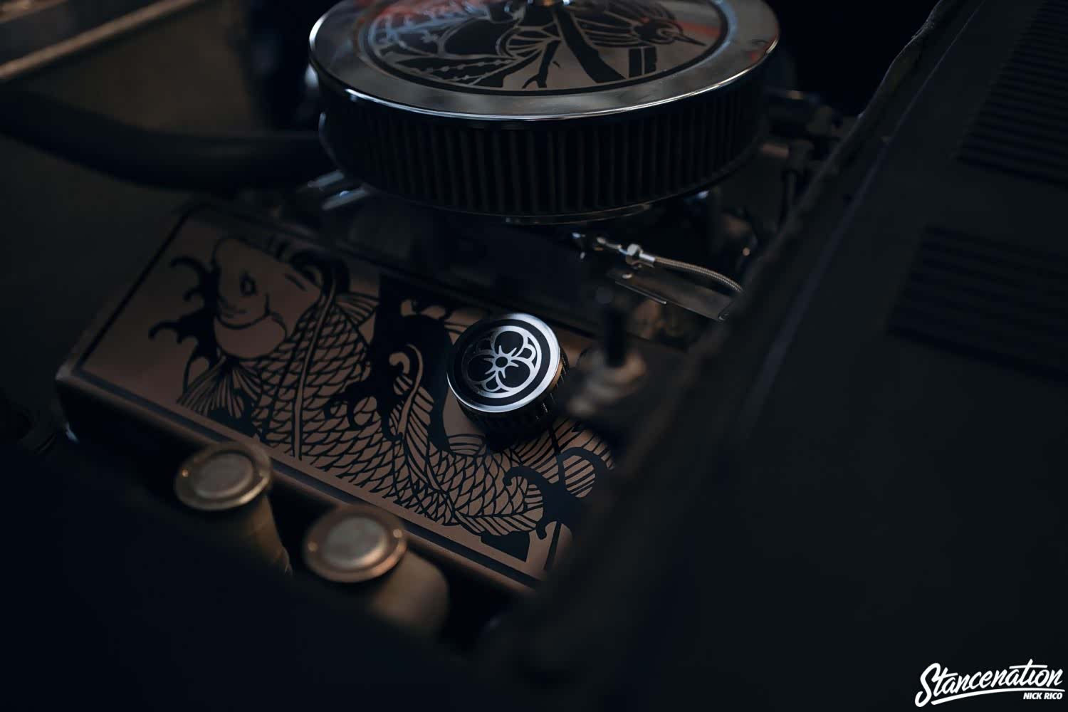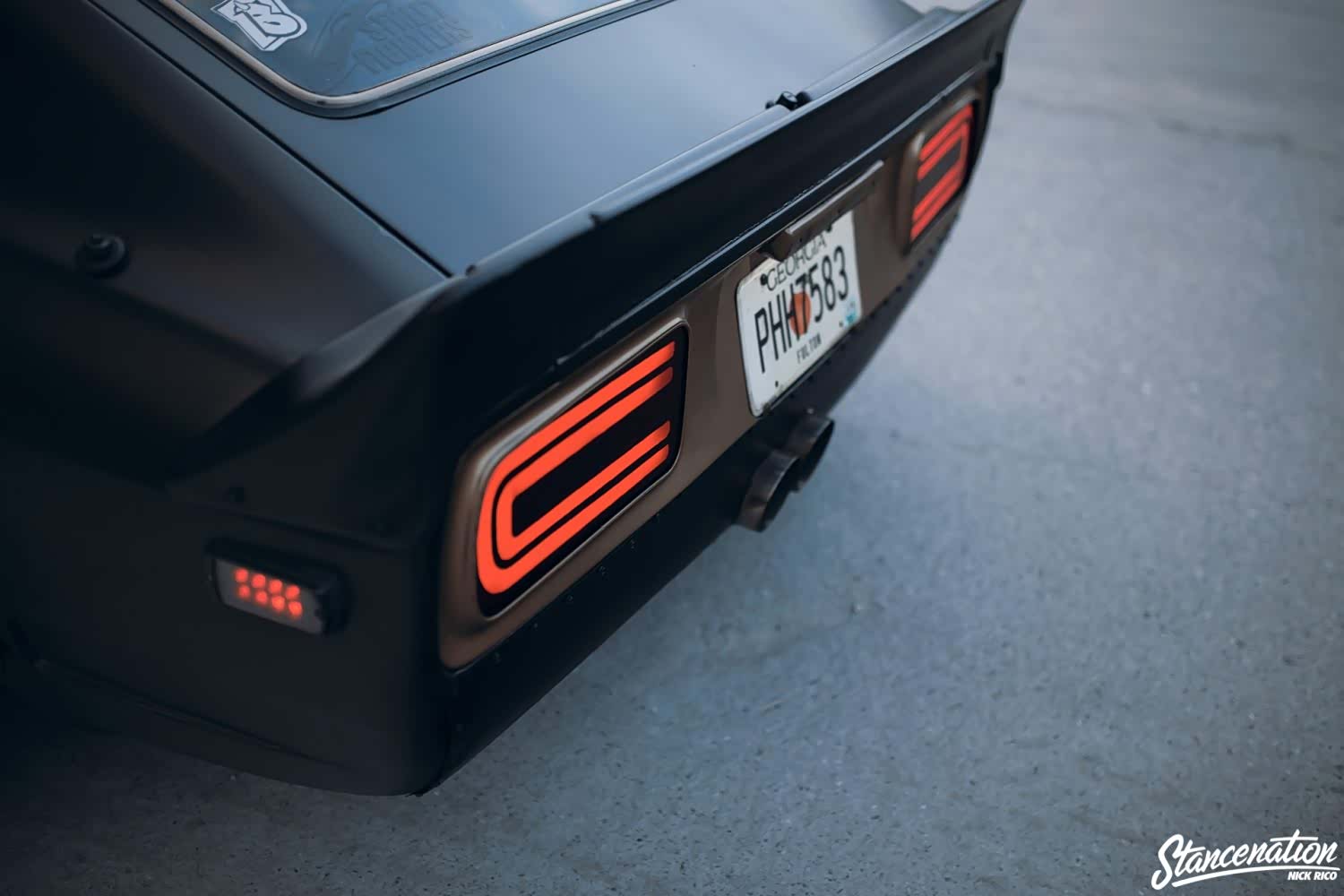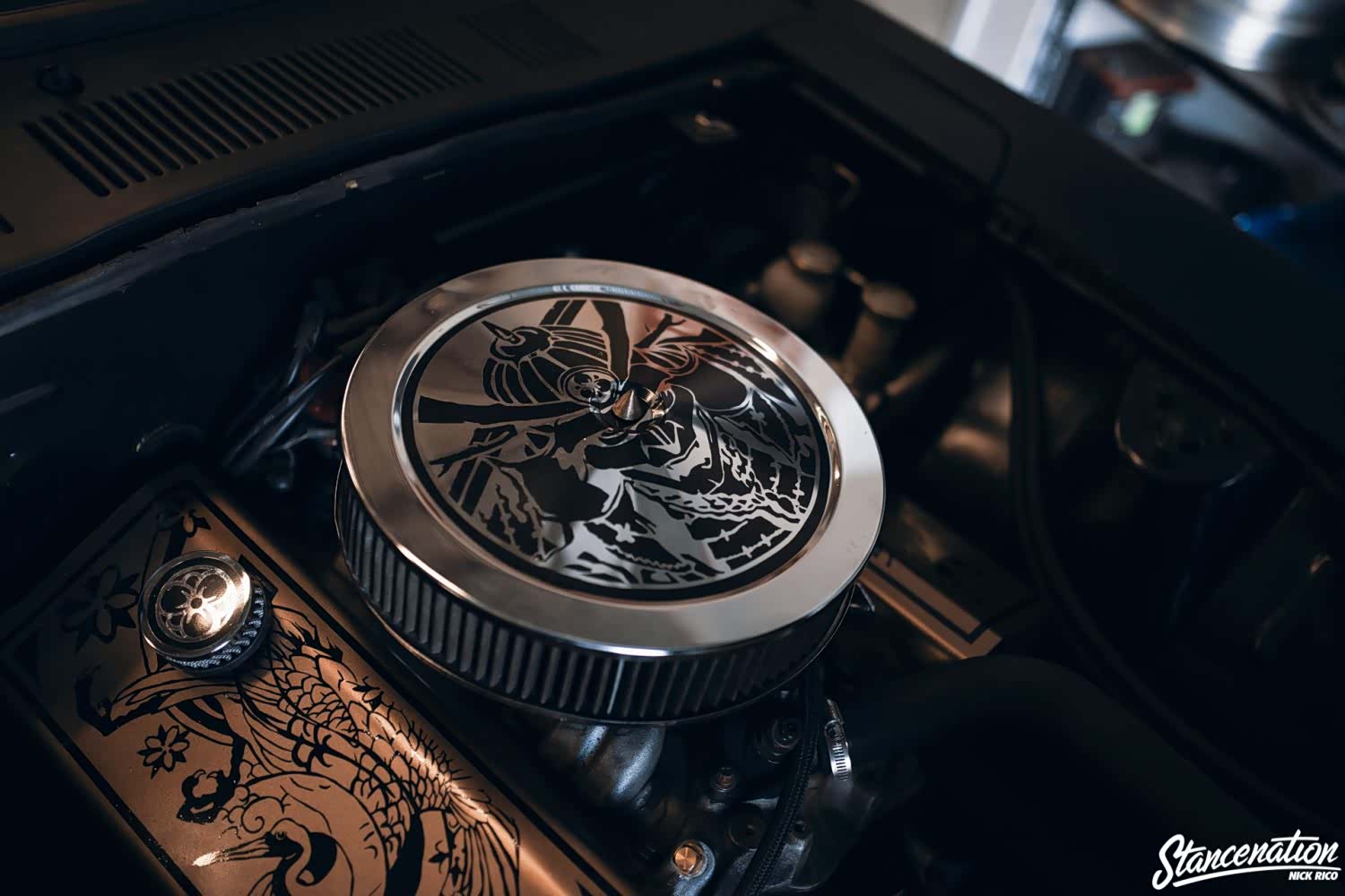 这辆240Z从里到外都展示出很特别的气场,从发动机舱特别的纹身涂装再到外观静谧严肃的外观,但是当车灯打开的那一刻,发动机从排气管发出沉寂已久的咆哮声时,似乎那辆"恶魔Z"正对你虎视眈眈!
