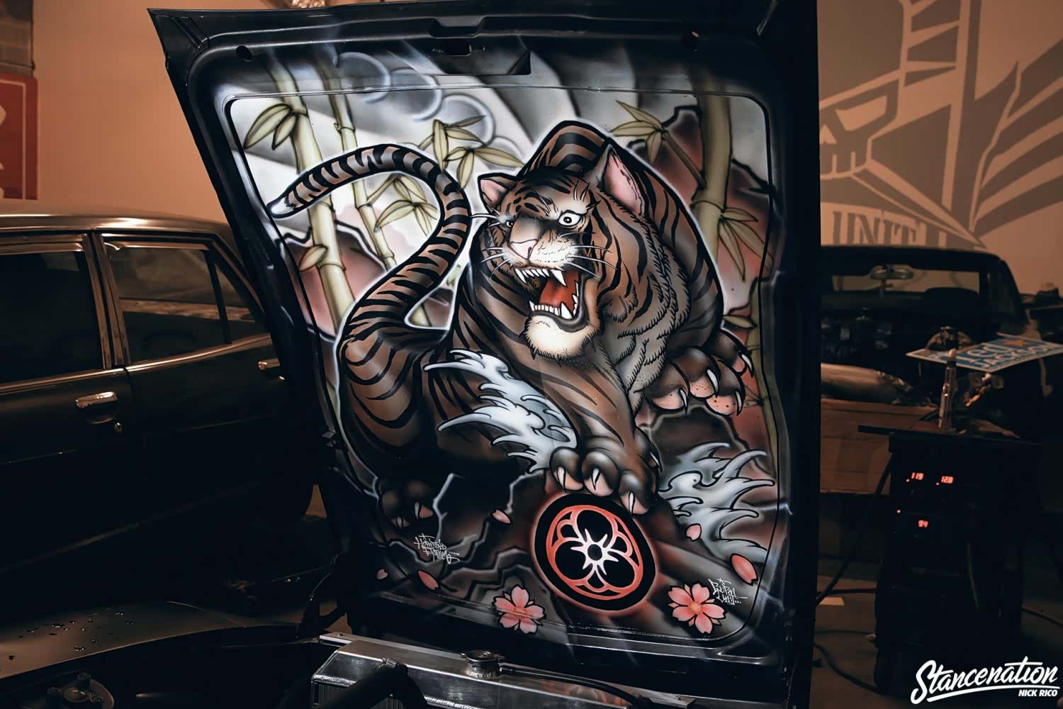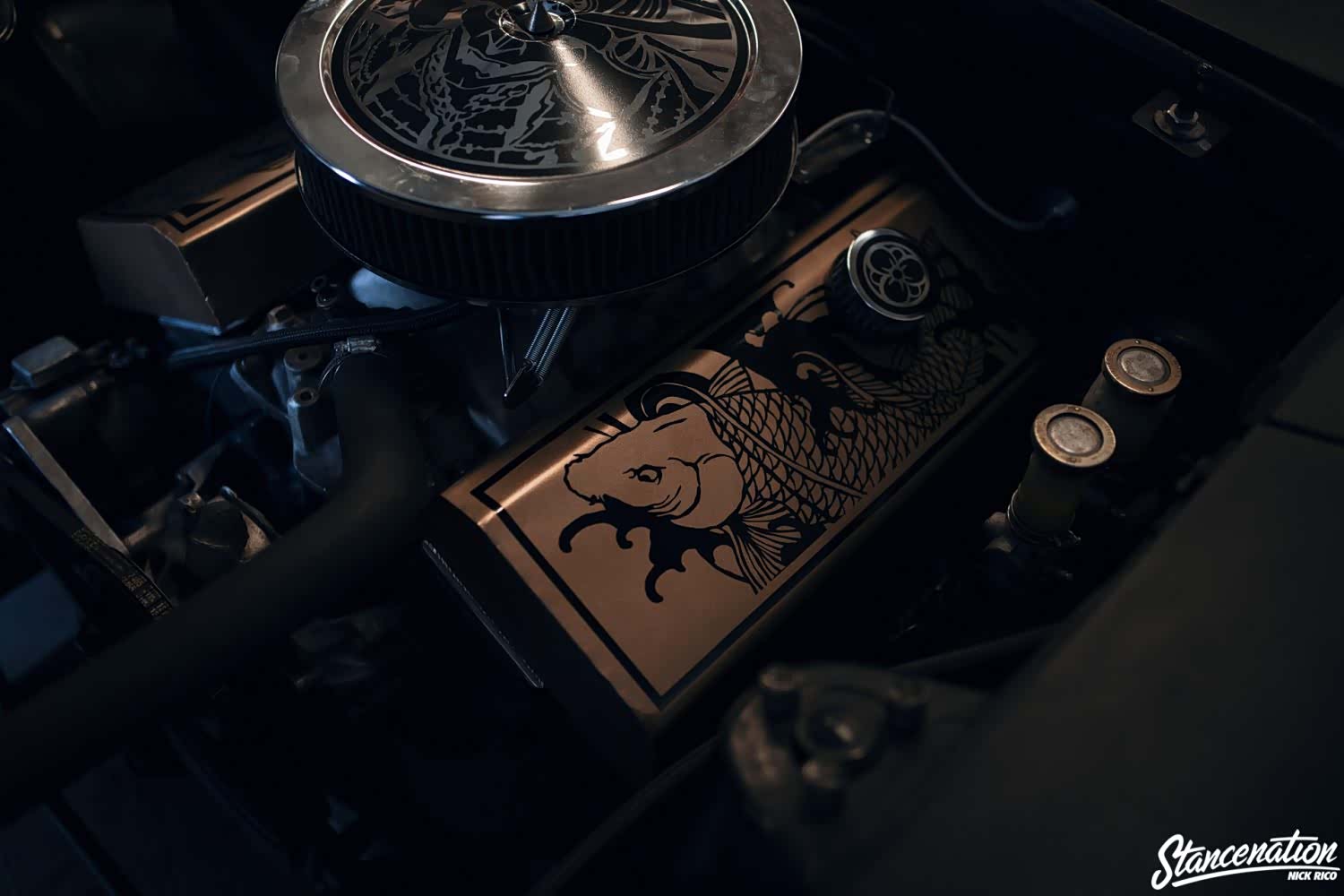 看到这个内饰,再看到这个特别的仪表,就更有不明觉厉的感觉,看起来很有战斗气息。打开发动机盖发现有一只凶猛的老虎在上面,原来它的L20直6发动机早已被V8的雪佛兰350发动机所替换,经过强化后通过定制排气更能发出恶魔般的咆哮。