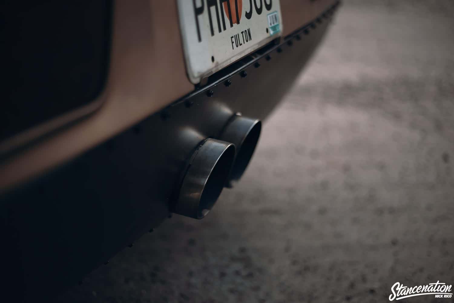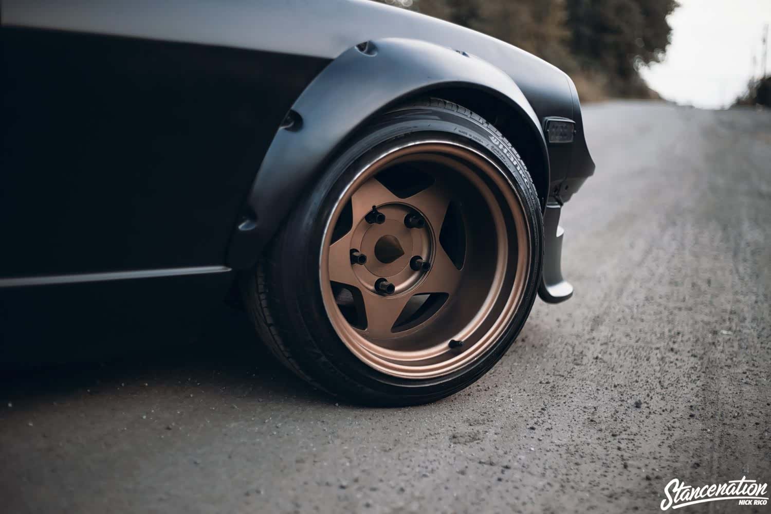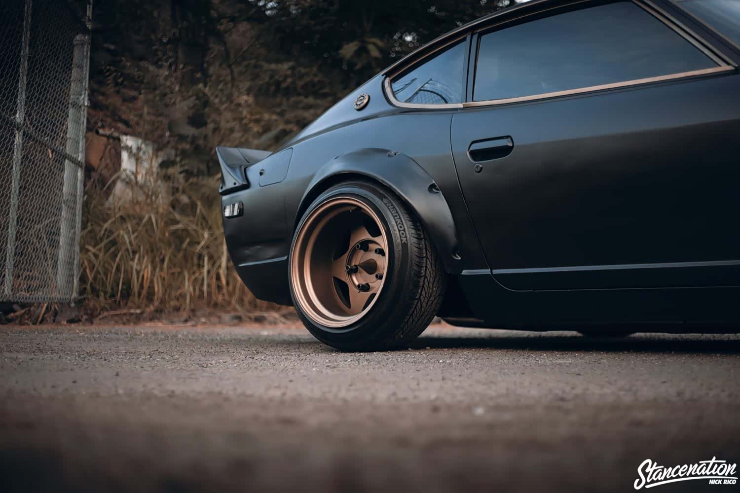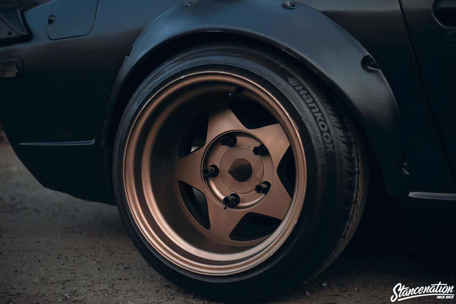 跟普通的240Z不同,车主还给它改装了铆钉宽体,十分粗犷。然后定制了一套T3绞牙避震降低车身,搭配一套15寸10J ET-52的古铜色五星轮毂,同时改装了一套来自丰田的刹车系统。