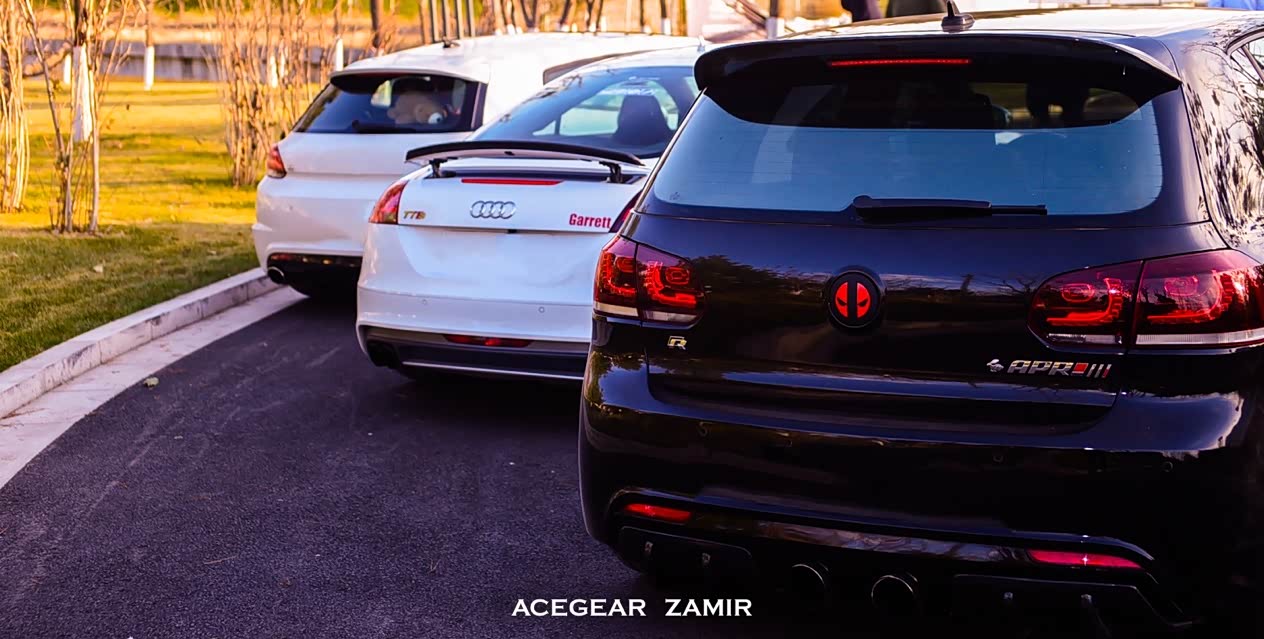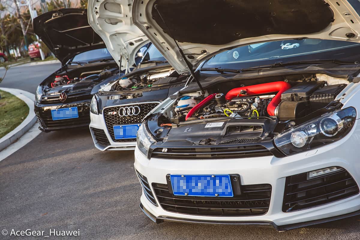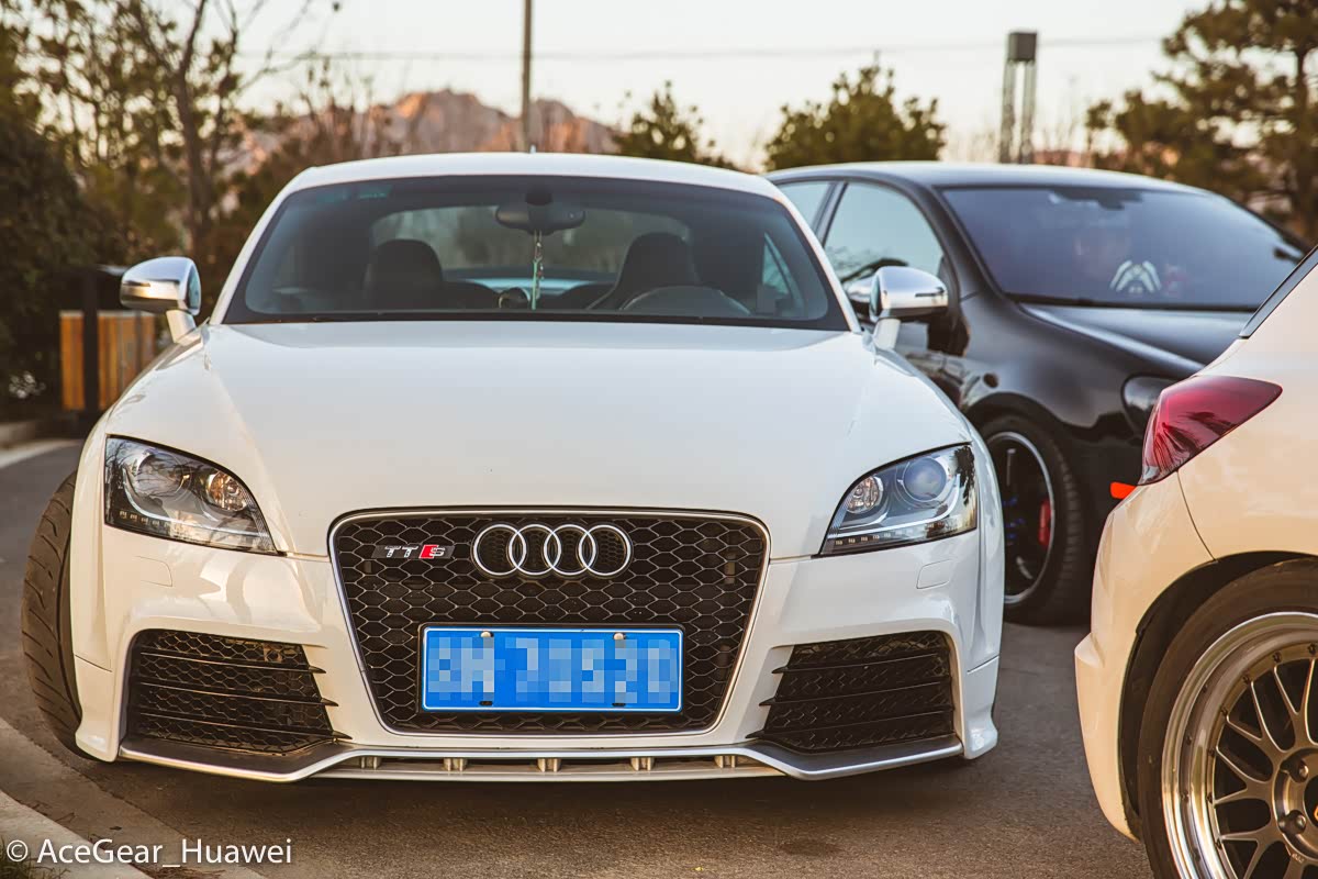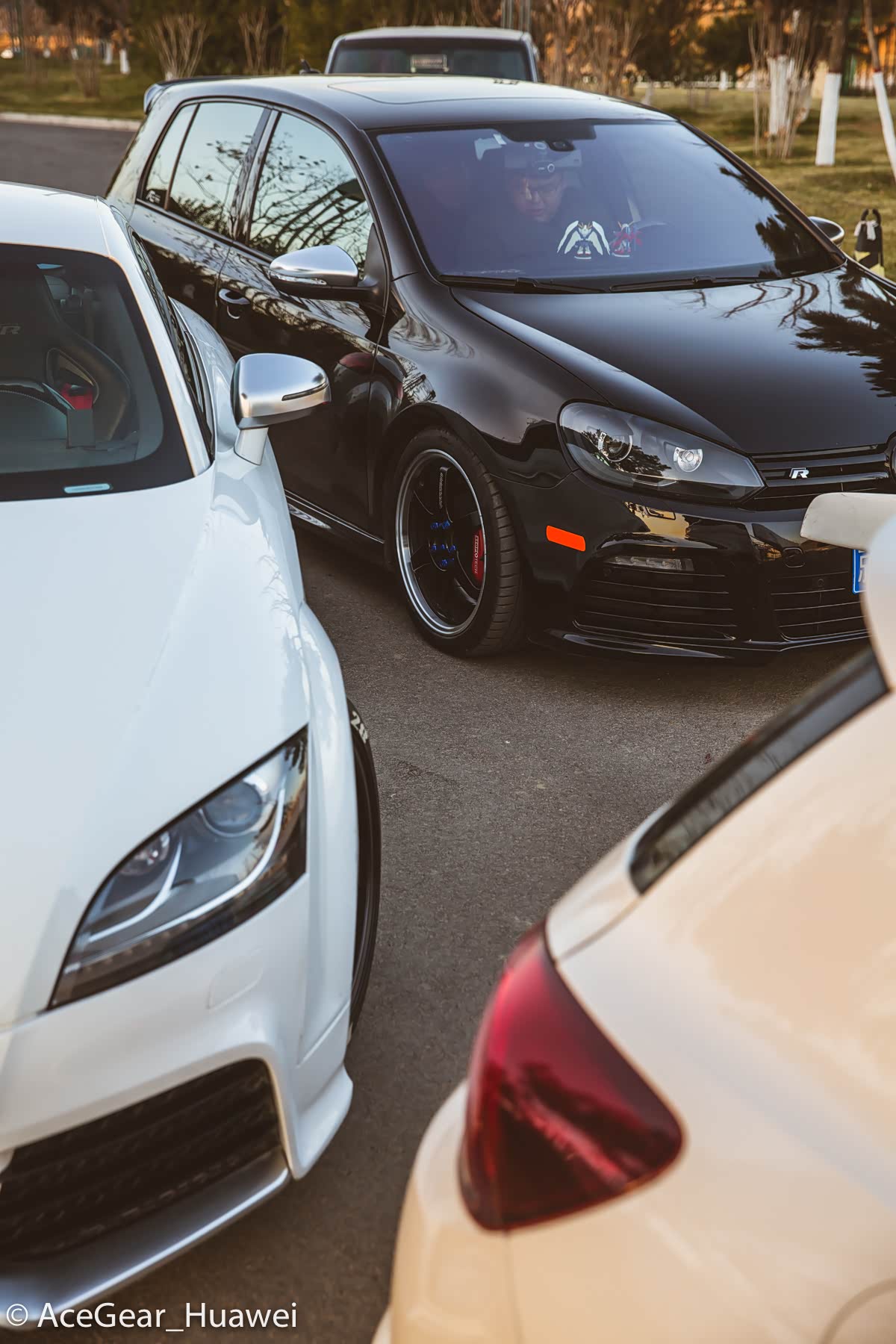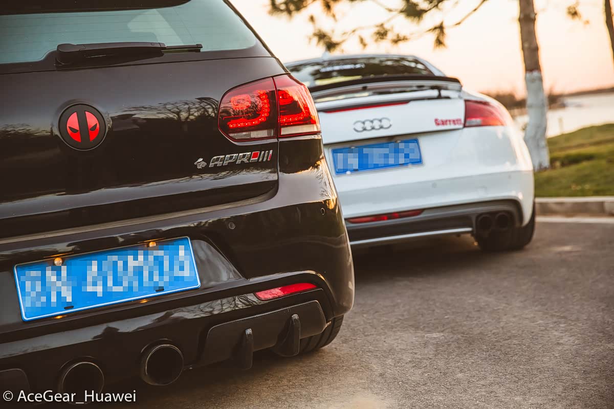话不多说,高清大图先来一波。图中亮点不知道有没有人发现呢,细心之人应该可以发现,两台车尾部都暗藏玄机。APR,大众车系十分出名的改装品牌,尤其是以ECU套件出名,这辆APR程序,换了高R尾灯的小黑车,我想不管到哪里,都一定是匹杀出重围的黑马。而旁边的TTS也不甘示弱,看到那一行小红字了么,来,大声点跟我一起读,盖~瑞~特,对没错,这台车原厂的涡轮已经不能以满足车主对性能的需求,换换换,这不就被车主换成了盖瑞特GTX2867R涡轮套件,我只想说,老板,还缺员工不。。。