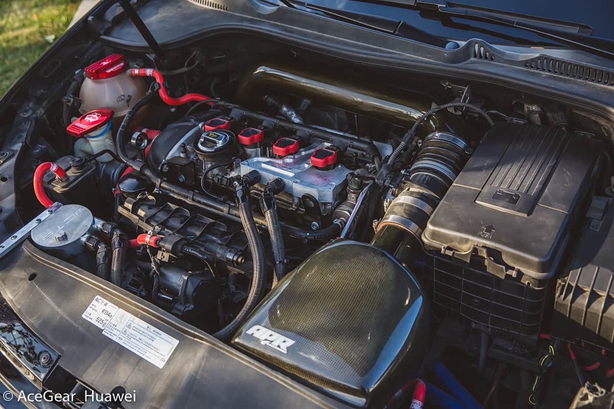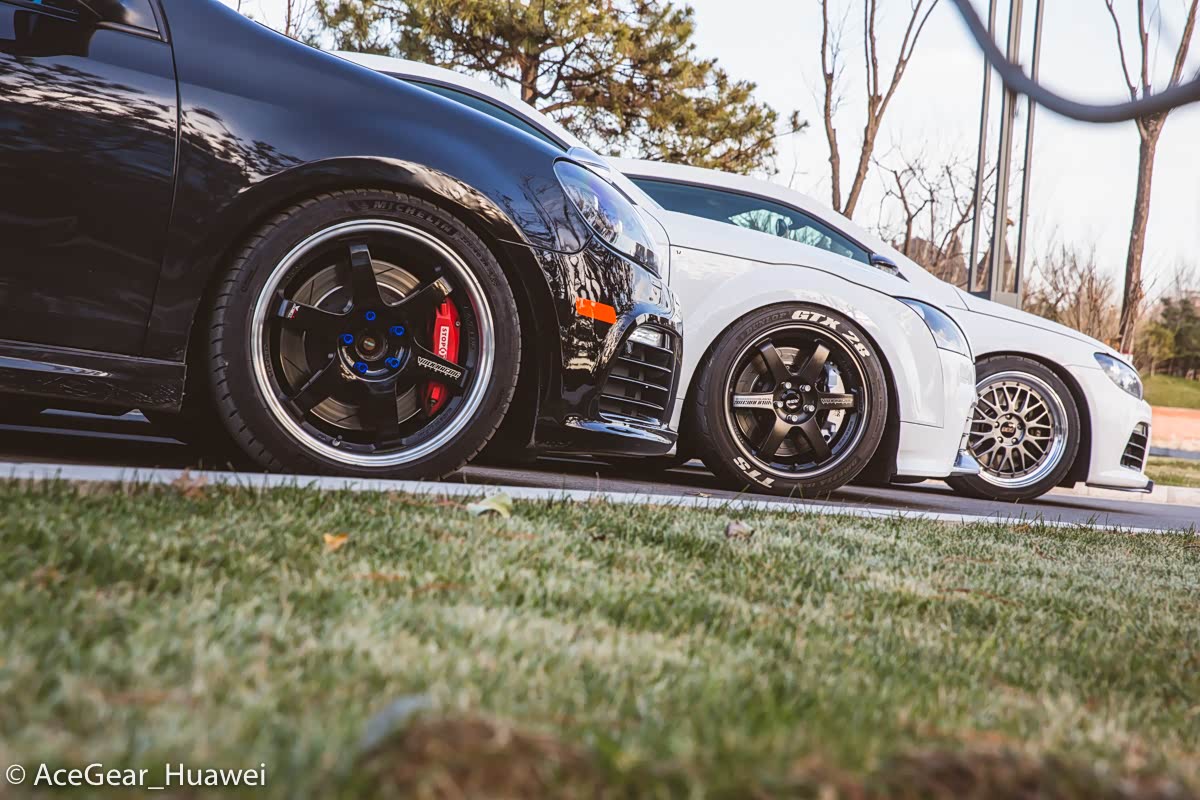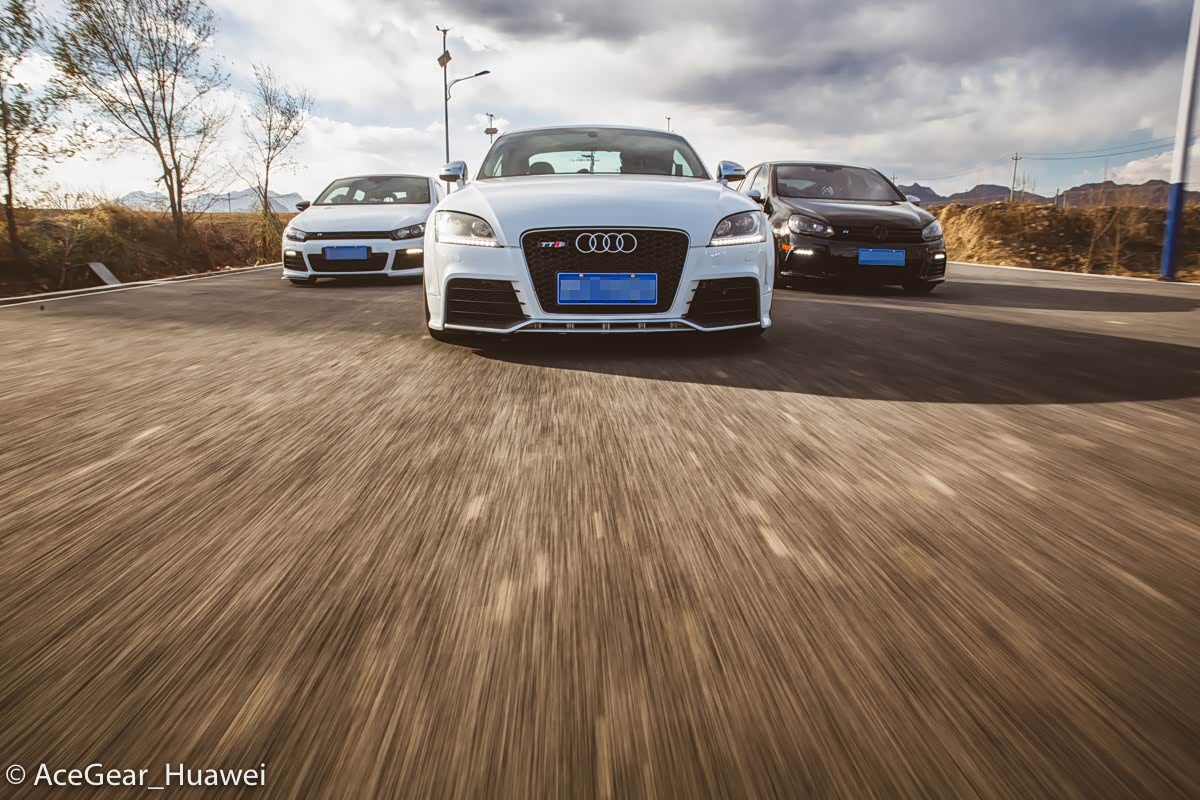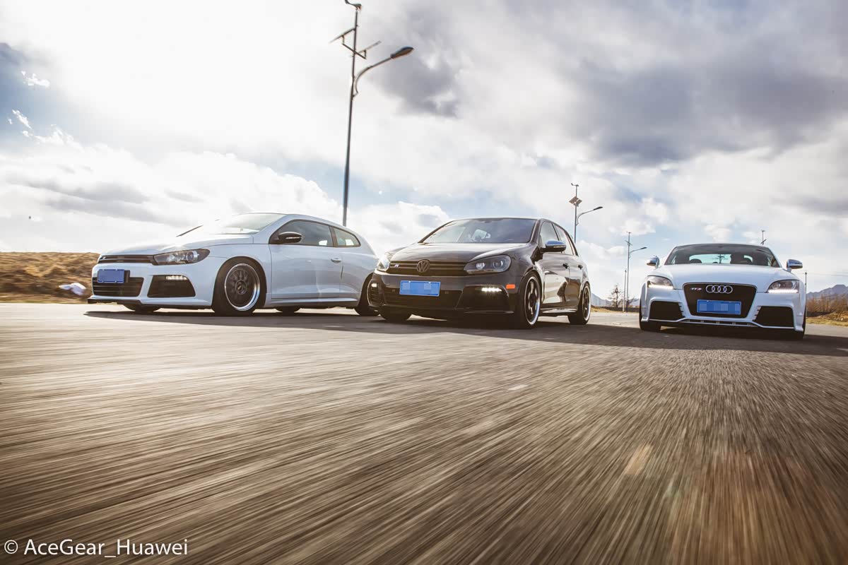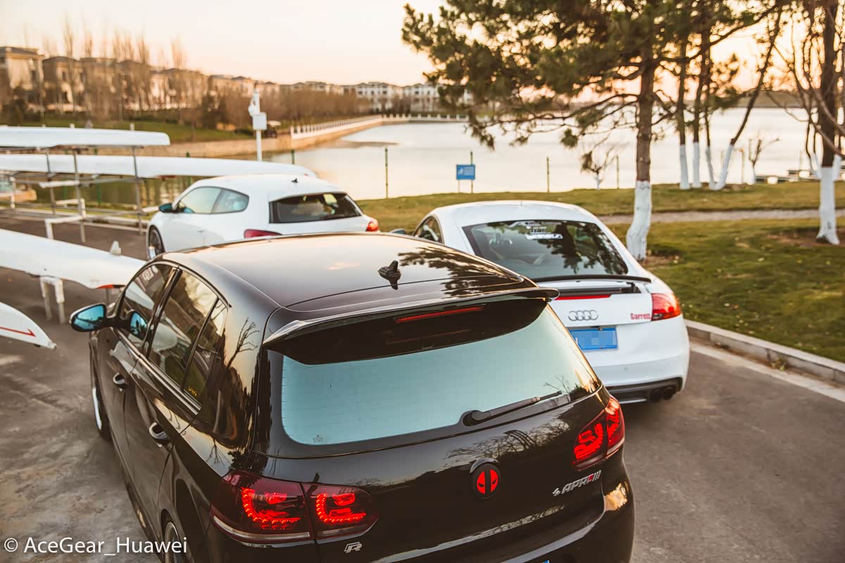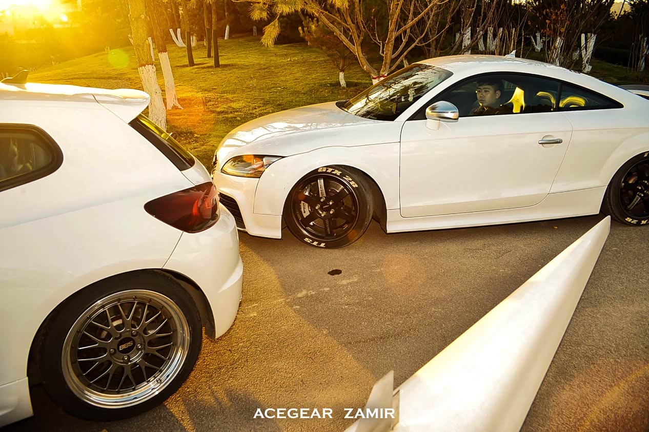 话不多说,高清大图先来一波。图中亮点不知道有没有人发现呢,细心之人应该可以发现,两台车尾部都暗藏玄机。APR,大众车系十分出名的改装品牌,尤其是以ECU套件出名,这辆APR程序,换了高R尾灯的小黑车,我想不管到哪里,都一定是匹杀出重围的黑马。而旁边的TTS也不甘示弱,看到那一行小红字了么,来,大声点跟我一起读,盖~瑞~特,对没错,这台车原厂的涡轮已经不能以满足车主对性能的需求,换换换,这不就被车主换成了盖瑞特GTX2867R涡轮套件,我只想说,老板,还缺员工不。。。