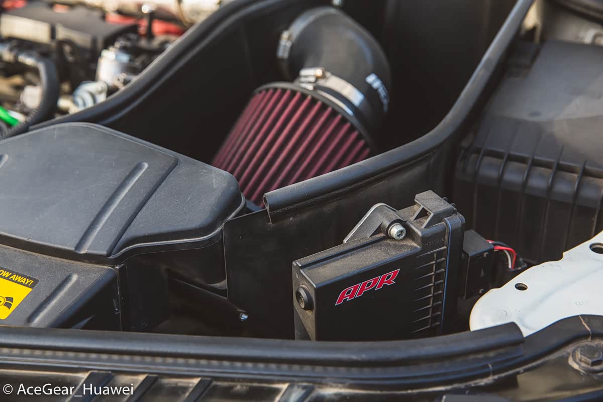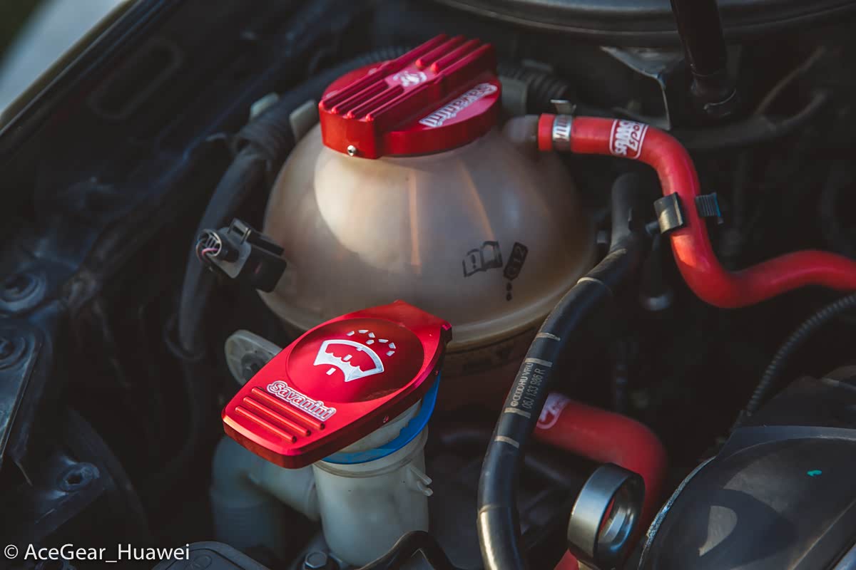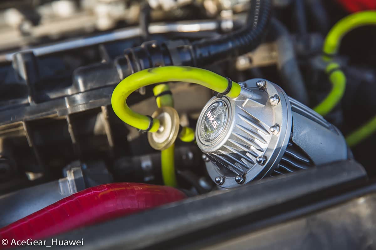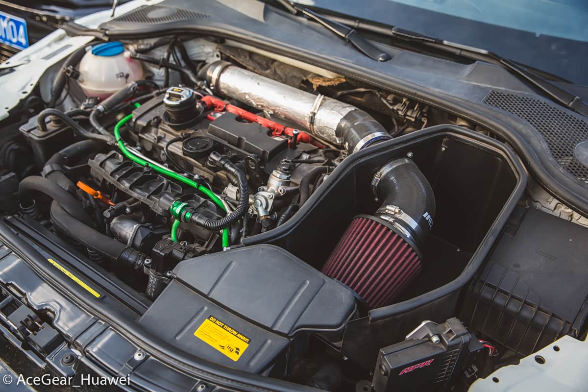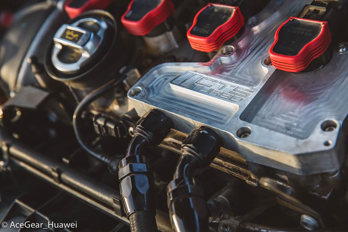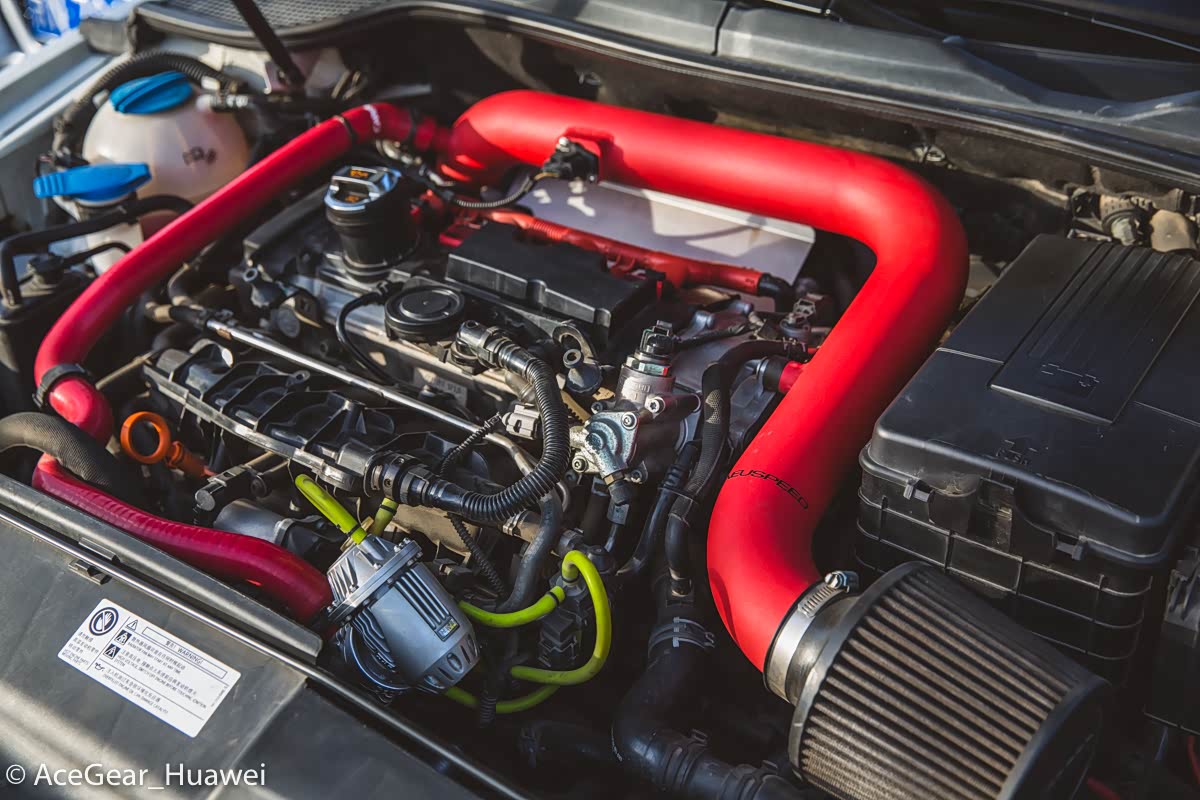 首先映入眼帘的就是这大红的Nuespeed进气套件,看起来就让人觉得很热血。同样为了配合Revo二阶的ECU程序,更换了NGK红头点火线圈,并改成了外泄,HSK泄压阀简直成了外泄标配,有多少人是被那销魂的泄压声索所毒到的。