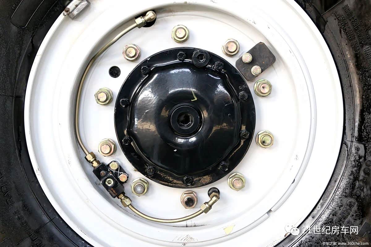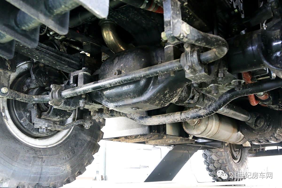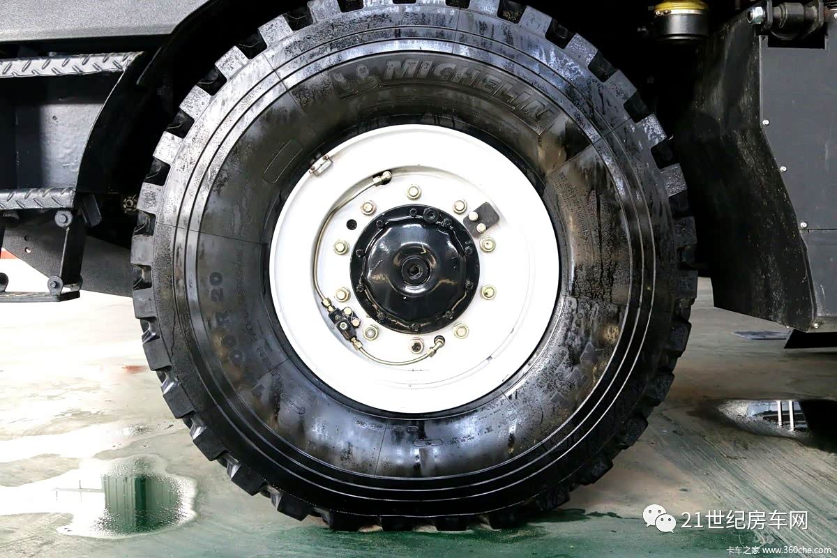 既然定位是越野房车,那么通过性自然是重中之重,这台车装配的全时四驱系统,双级减速车桥,前后桥一共有三把差速锁。并且搭配的是米其林重负荷全地形越野轮胎,型号为14.00,配有中央充放气系统。
