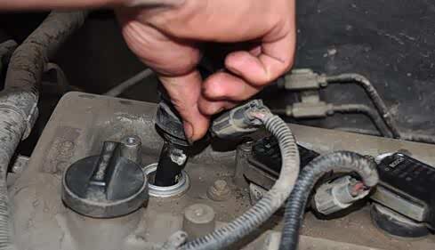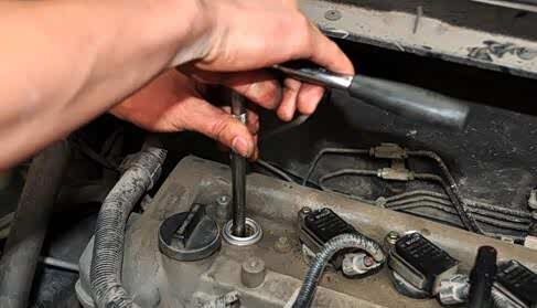 第四,在点火线圈的孔中插入火花塞套筒,套牢原火花塞,逆时针旋转拆出;