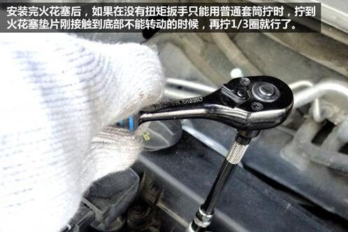 第六,小心插入孔中并顺时针拧紧新火花塞,用扭矩扳手的话先查阅下手册,各车型厂商建议的扭矩不一样,一般是20-30Nm。普通套筒扳手的话拧到火花塞上力后(接触底部),再拧120-180度即可。这里要注意不能拧的偏斜或过紧,缸顶螺纹滑牙了那不是一般的麻烦,是非常麻烦;