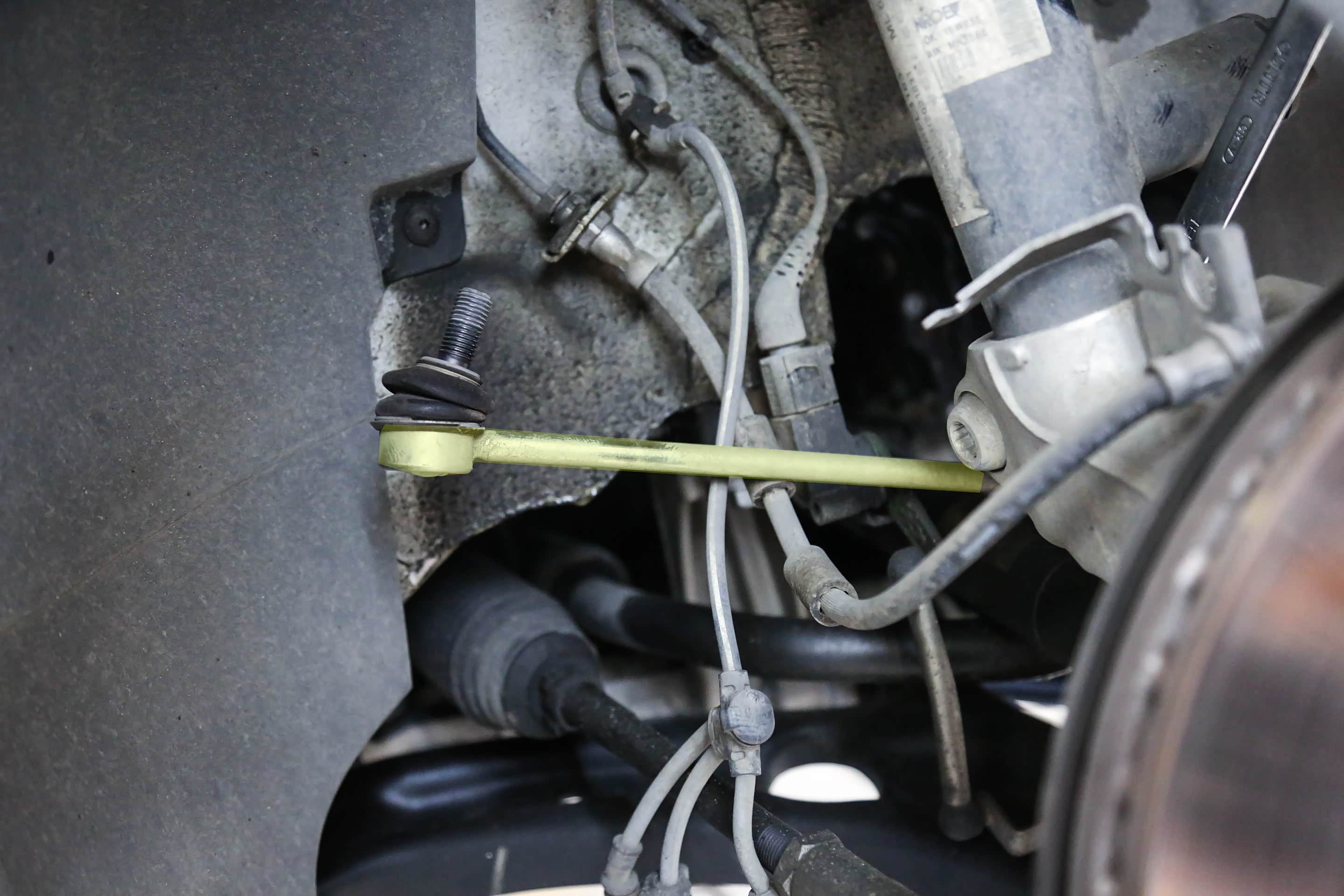 可以看出,前稳定杆还是比较粗壮的,这对于车辆操控有一定的提升,稳定杆连接在减震器上,连接杆为铝制。(标黄的为稳定杆)