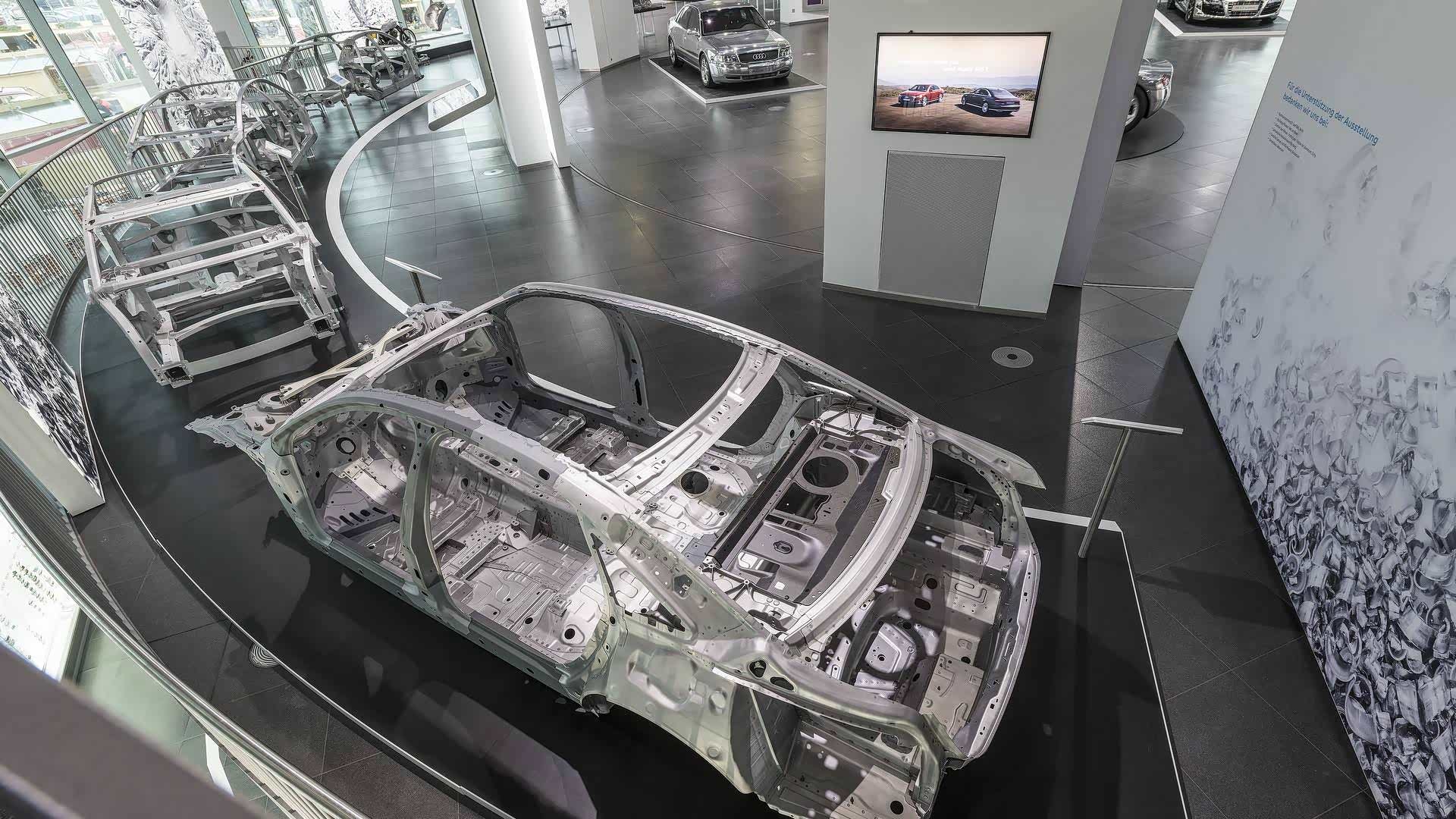 与传统的车用钢材相比,铝合金车身在重量上减少了40%,在奥迪的“黄金年代”(90年代),其甚至表示车身重量可降低60%,并且能够保证安全性,而这也是在某些特定车身部位,使用了两倍于钢材厚度的铝合金材质所赐。