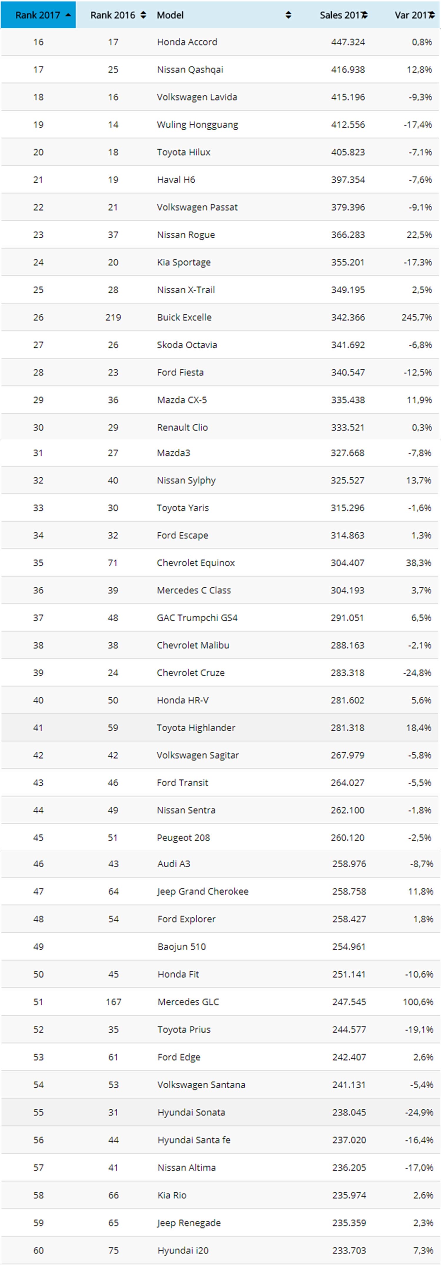 在2017年前十个月,全球汽车市场继续以4%的增长速度增长,而增长最快的部分当属SUV(12%),这一趋势可以在排名中看出,尤其是与2016年相比较。