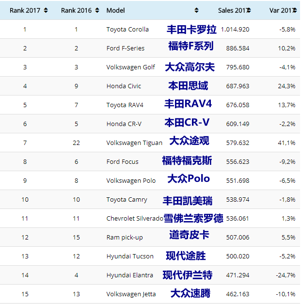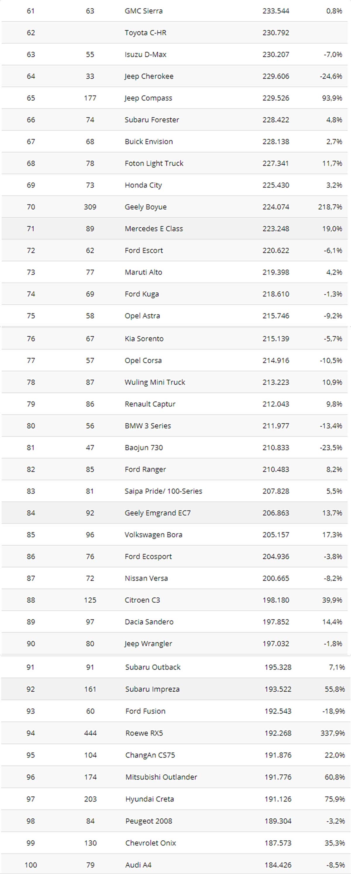 好了,具体车型对应的排名见下表,看看自己有没有为这些车买单?