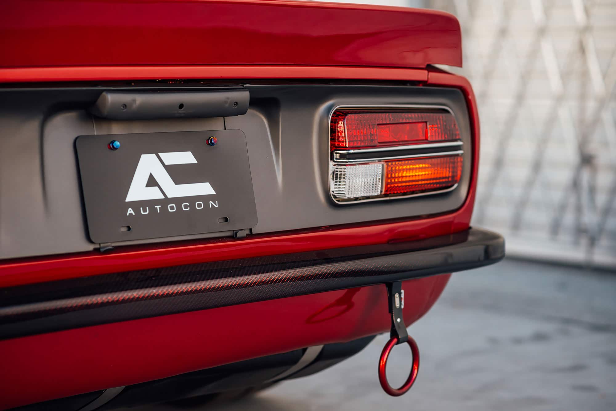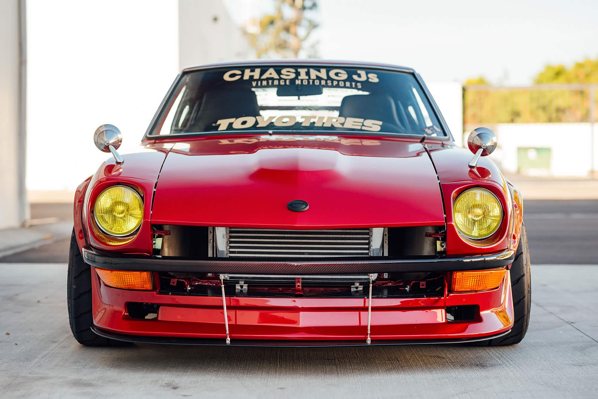 既然是圣诞老人的座驾,那就肯定要涂上喜庆的红色啦。暖色调的头灯十分有JDM的味道!碳纤维的前保险杠与前铲加上拖车钩显得十分之战斗格!前包围后的中冷让大家不禁猜想这部恶魔Z的心脏是否更已换为SR20DET或者RB26DETT之流!