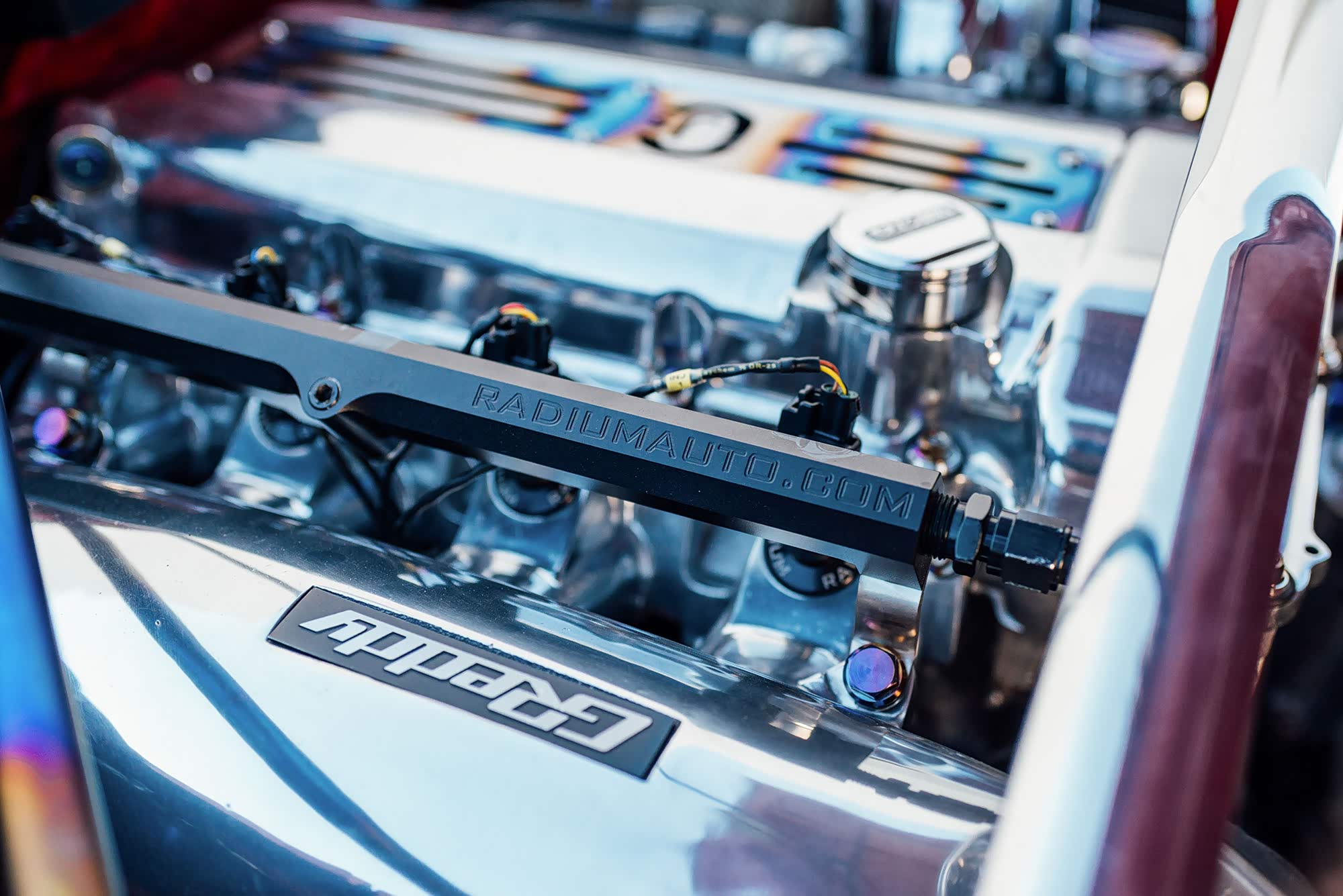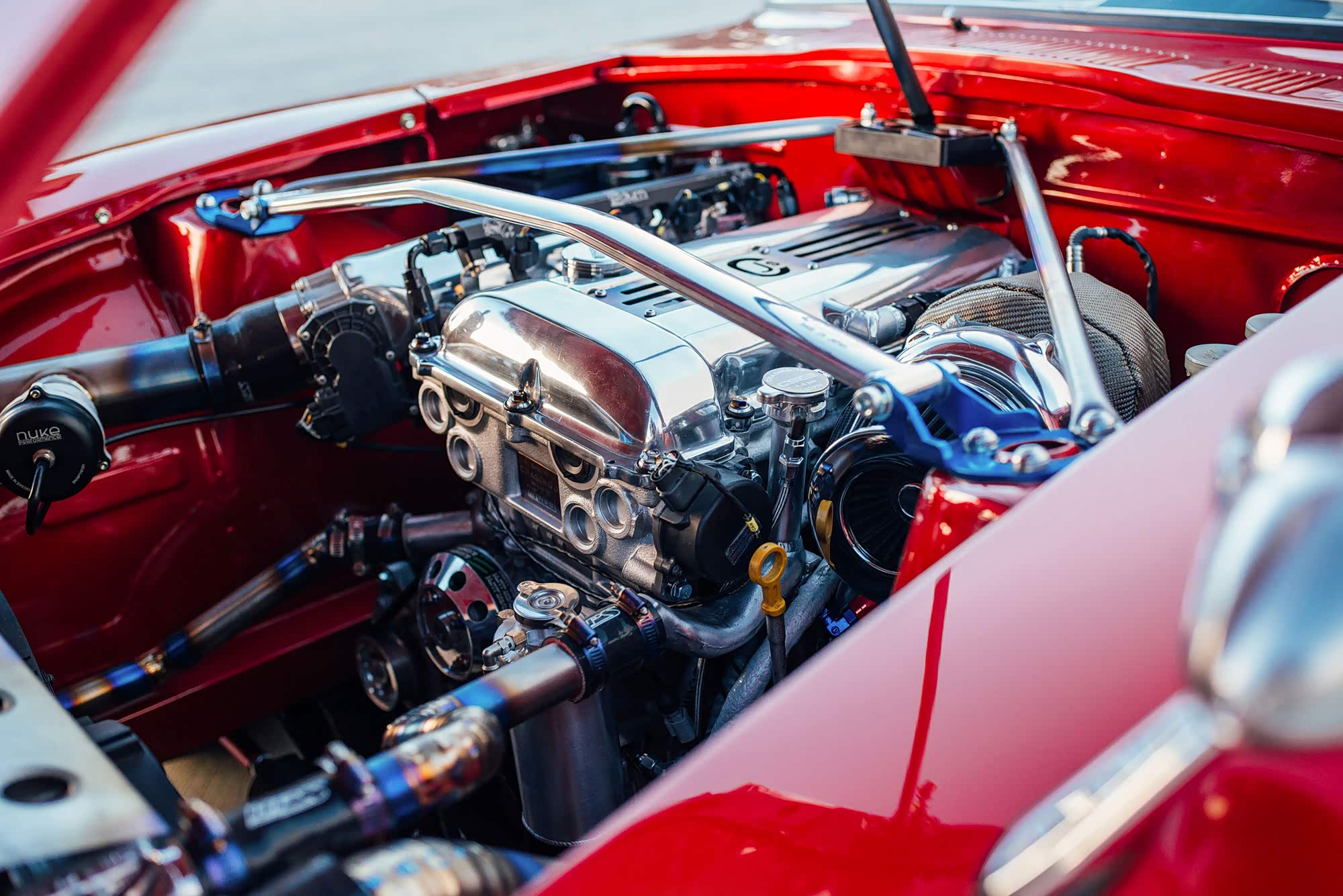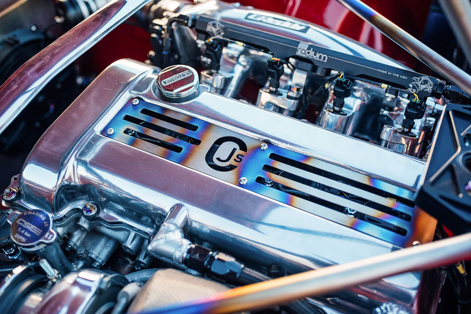 打开极具时代特色的前翻式引擎盖,我们可以看到躺在钛合金三点式顶吧底下的那台东瀛铭机,SR20DET。这台SR20DET来自于飞鸡S13身上,不过在盖瑞特GTX3071R涡轮的加持下,达到了轮上428马力的惊人实力!