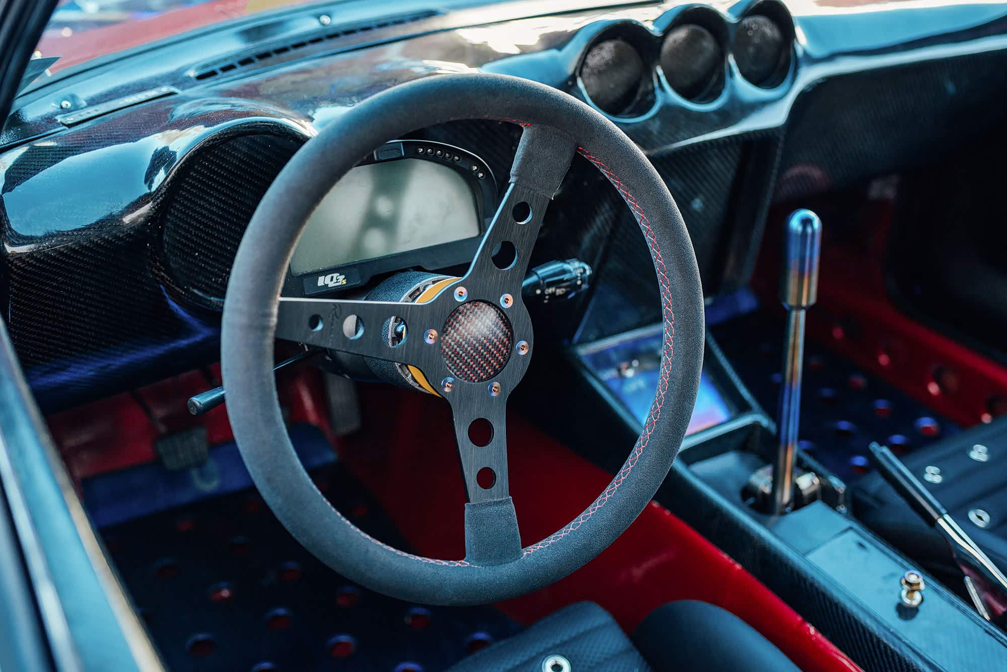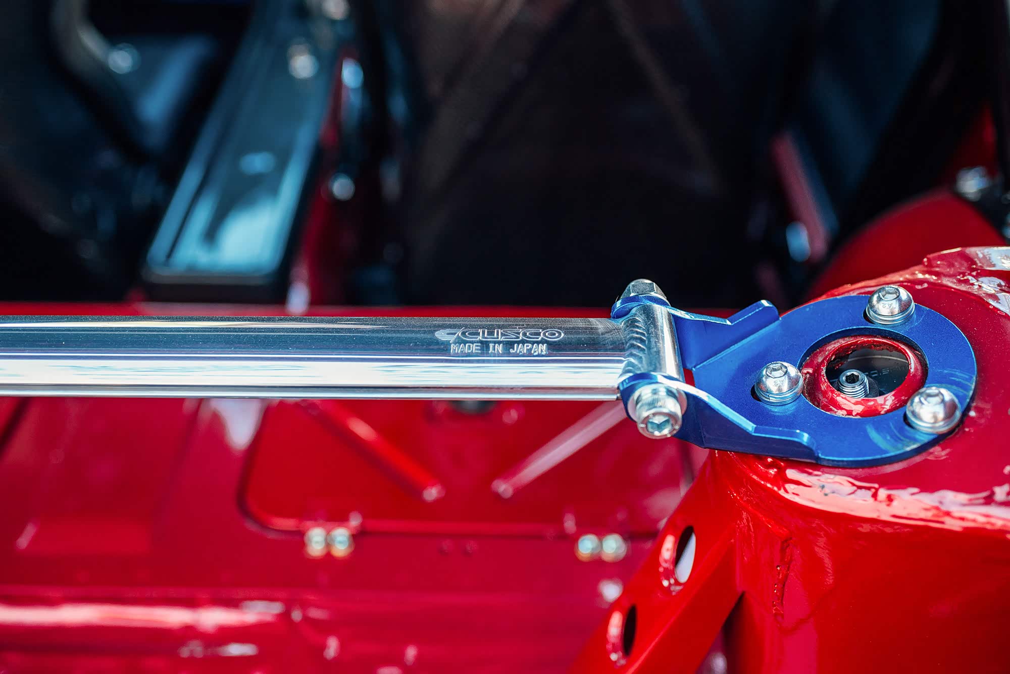 内饰方面,Cusco的bar件与定制防滚笼的加入提高了车身的刚性,毕竟已经抱经四十多年的风霜了,车架强度肯定不是很足。三幅式的赛车方向盘与Racepak IQ3S数字仪表盘,让人看着就热血沸腾。
