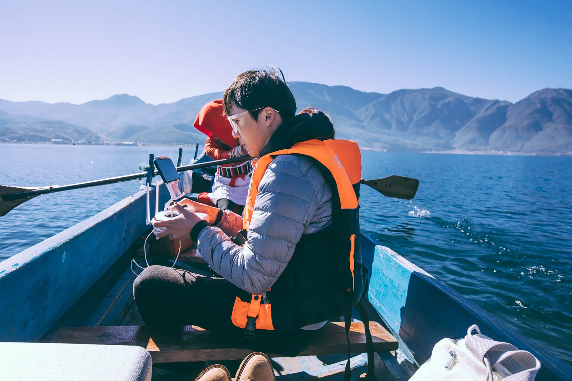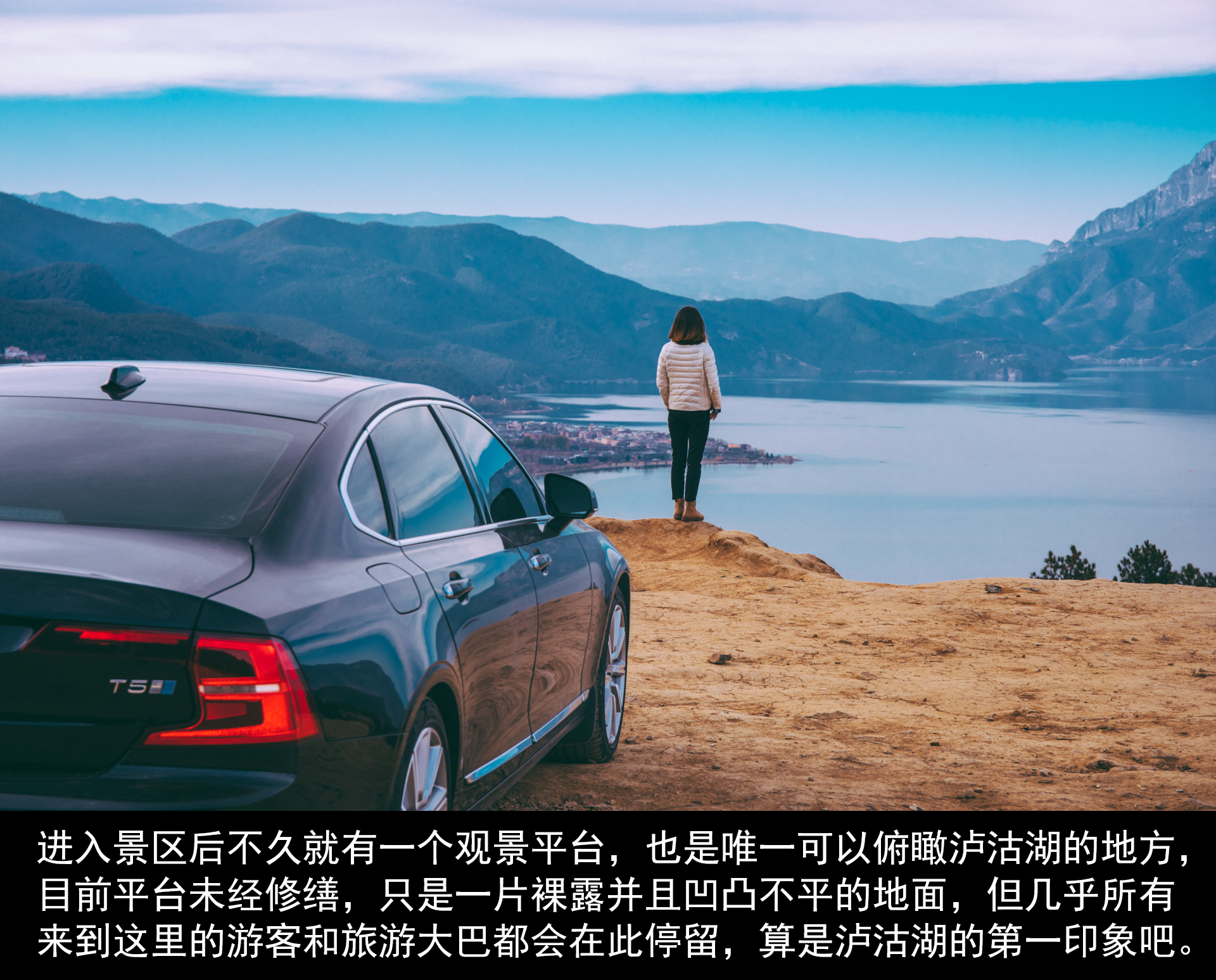 过了售票处沿路向前几百米有一个可以俯瞰泸沽湖的观景台,目前观景台硬件设施还在建设中,但不影响所有到达的人先在这里停留观赏。远看泸沽湖纯净透亮,安静得如同一面蓝色镜子。几艘小木船划破水面留下浅浅水纹,波澜散开,湖面很快又恢复平静。