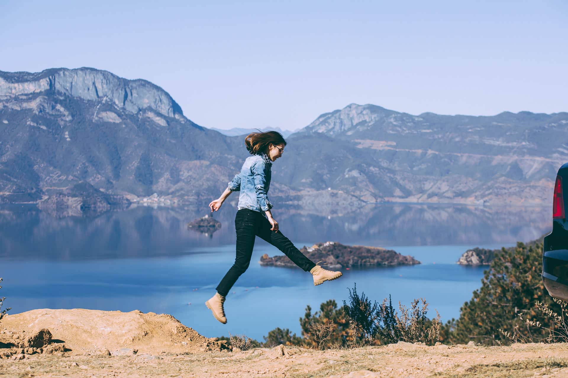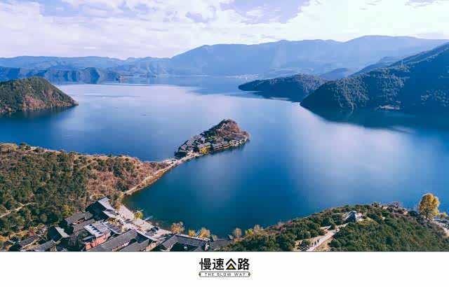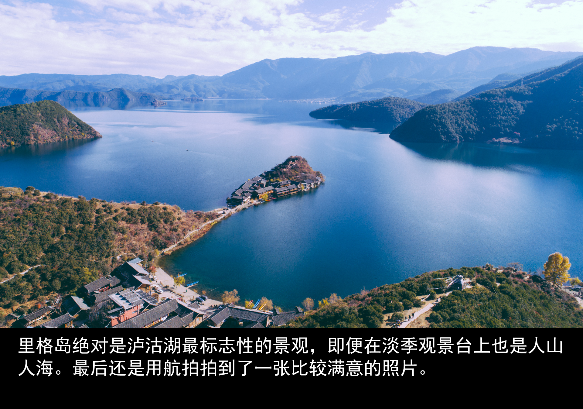 秋日暖阳晒在身上 车上继续向前开始上坡,最高处的观景台上聚集了许多人,在这里可以俯瞰泸沽湖最具标志的景观——里格岛。和其他岛屿循规蹈矩不同,里格岛仿佛上帝给泸沽湖留下的神来一笔,与主岛密不可分,又独立延伸在外。在观景台上拍出来的照片,仔细辨认一下会发现,这个角度的泸沽湖呈现一颗爱心的形状,真可以拿着去跟朋友吹嘘,上帝造个湖,都是爱你的形状。