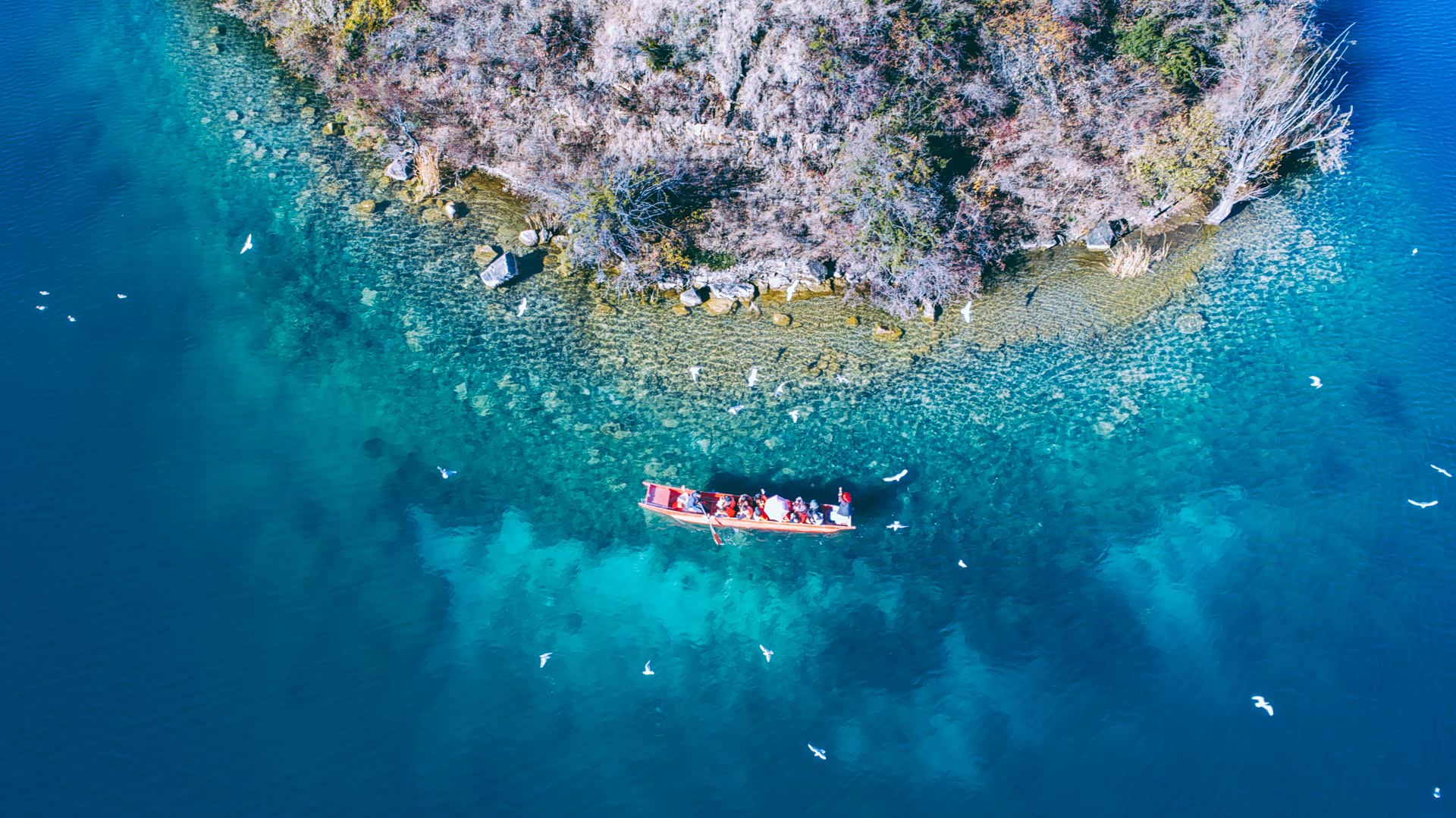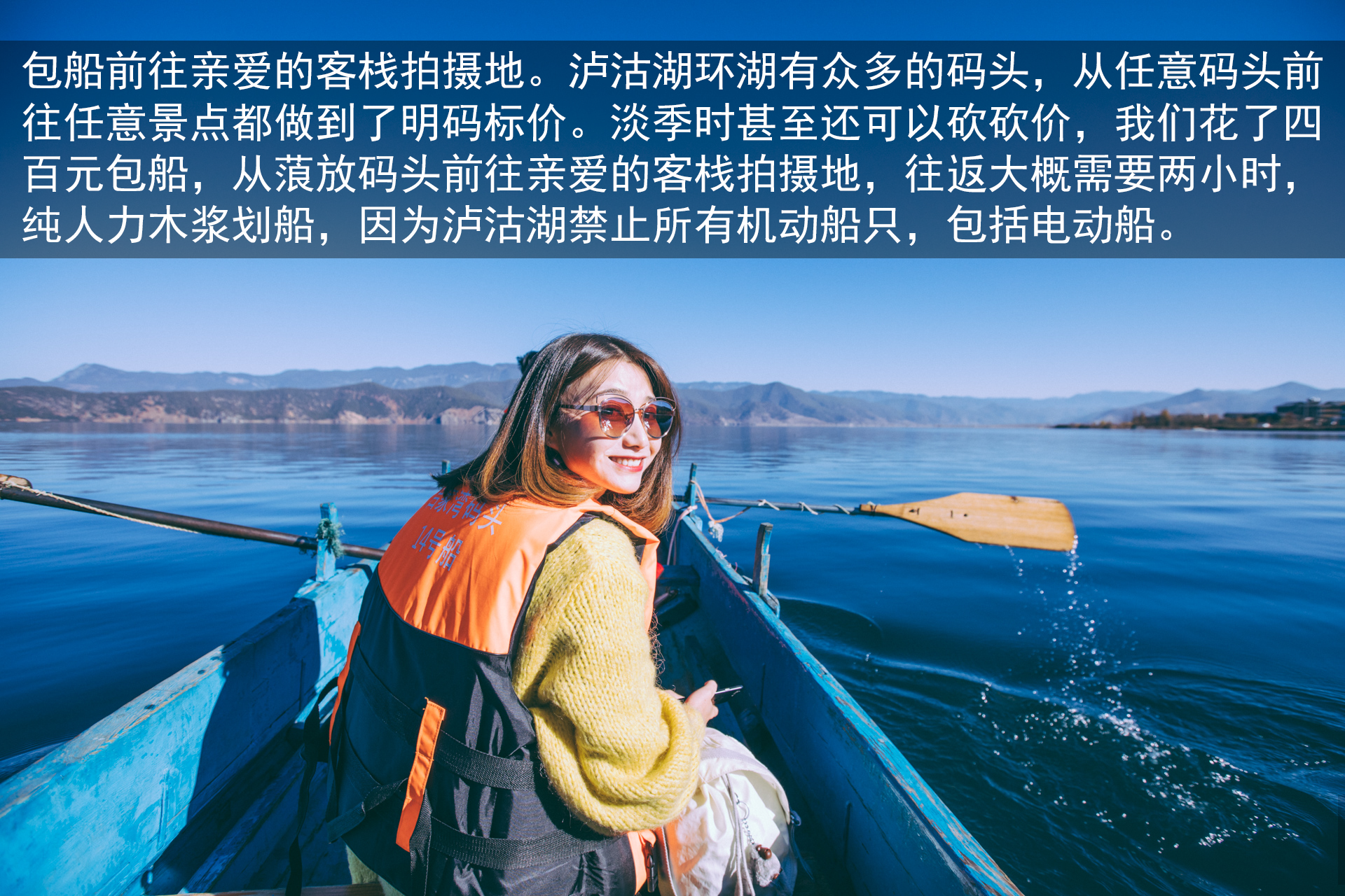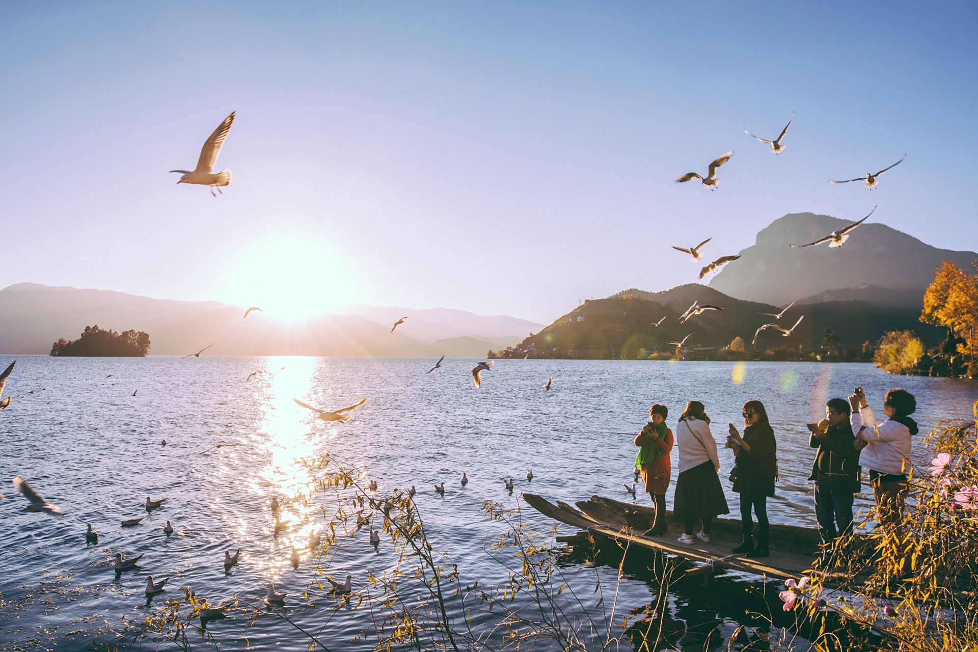 临近日落很多红嘴海鸥在和游客讨食环湖一圈我们大概用了5个多小时,慢慢走慢慢拍,整个泸沽湖从近水到俯瞰各有各的美,走完一圈依旧让人意犹未尽。于是第二天一早,我们就直接到酒店外50米的码头,准备以更加亲水的方式和泸沽湖亲密接触。