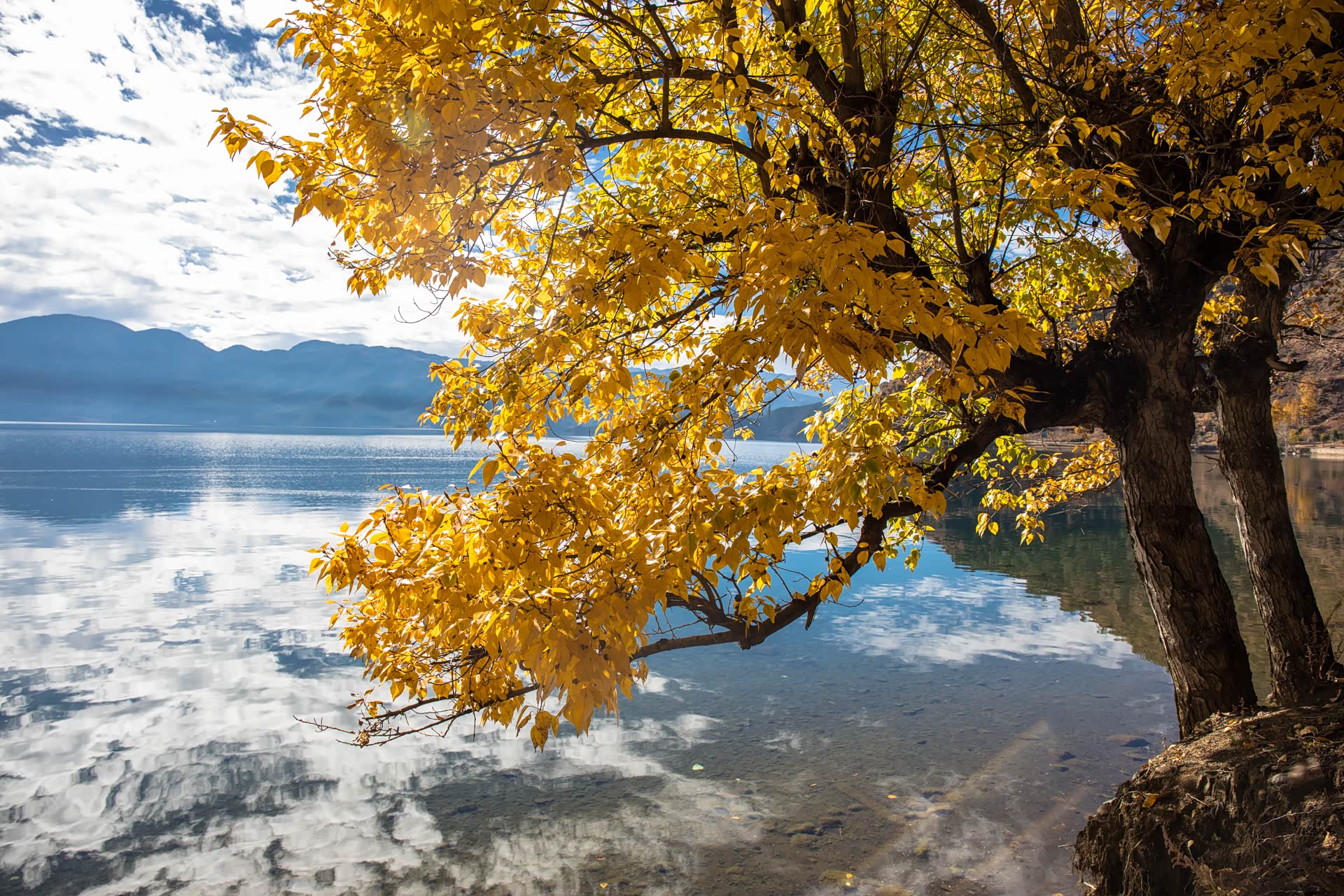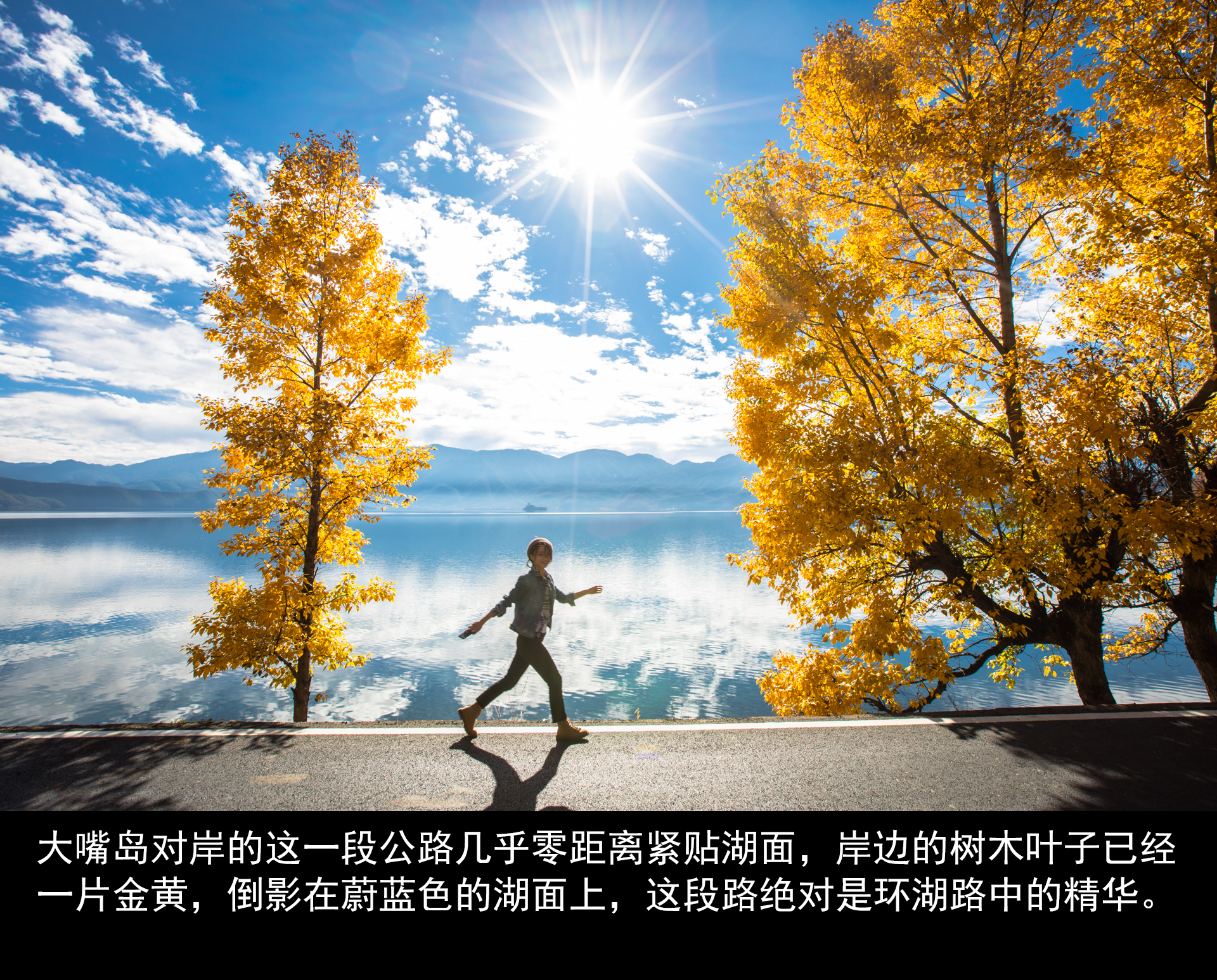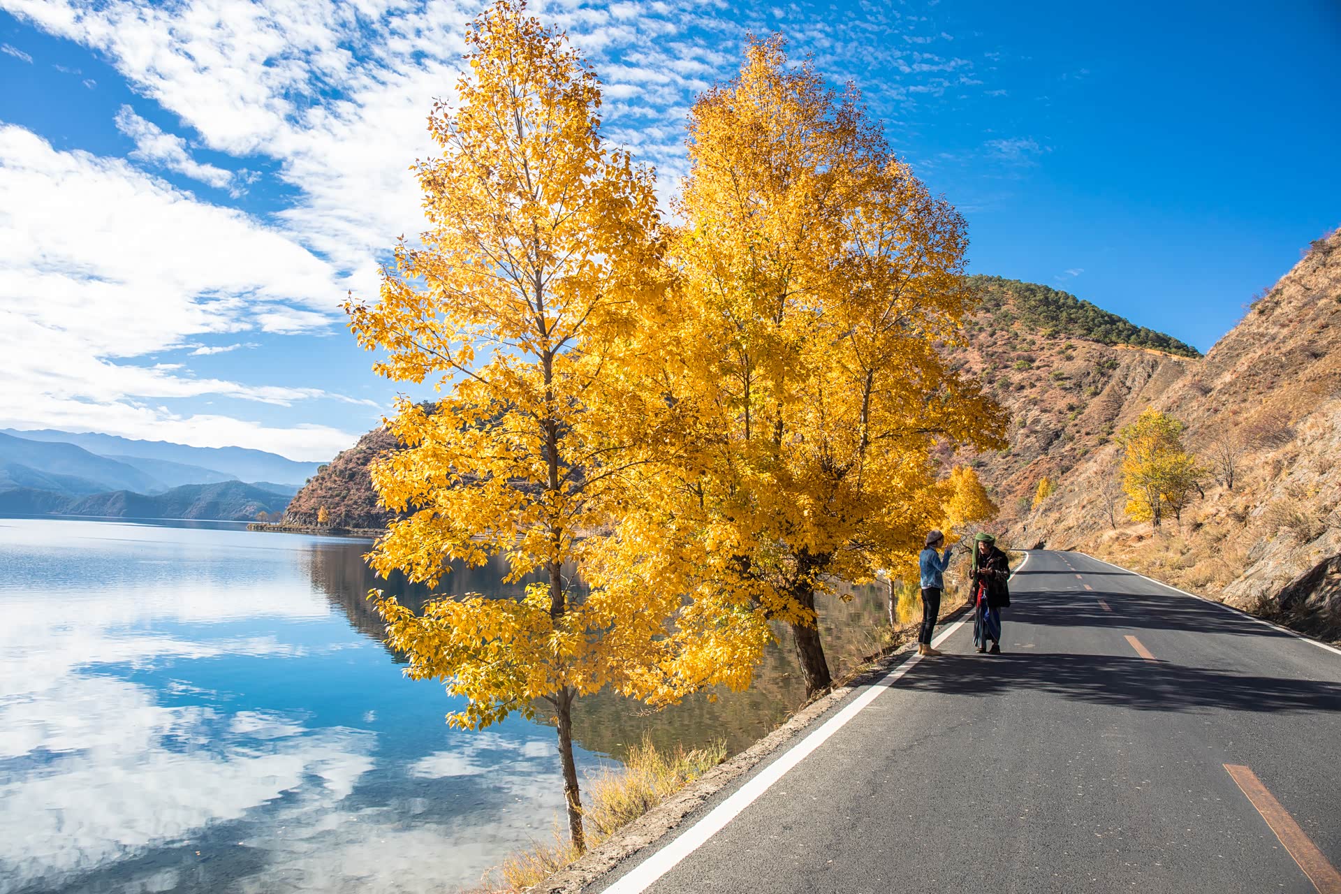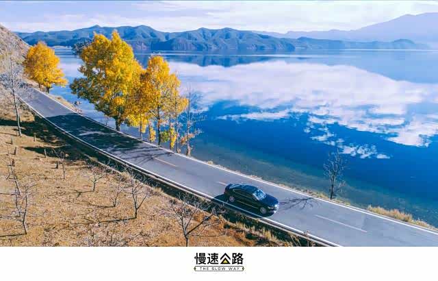 进入四川泸沽湖片区我们到的这个季节,算是泸沽湖的秋天。沿路常有整颗大树挂满金黄树叶的美景。下面这几张照片,是在出了泸沽湖镇不远、大嘴岛对面这段环湖路上捕捉到的景色。如果说码头、栈道还常有旅行团的车辆停靠,那像这样路边的美景,就只属于我们这些自驾爱好者的私藏了。把车停靠在路边不影响交通的地方,慢慢欣赏这湛蓝湖水和一树金黄的相得益彰。