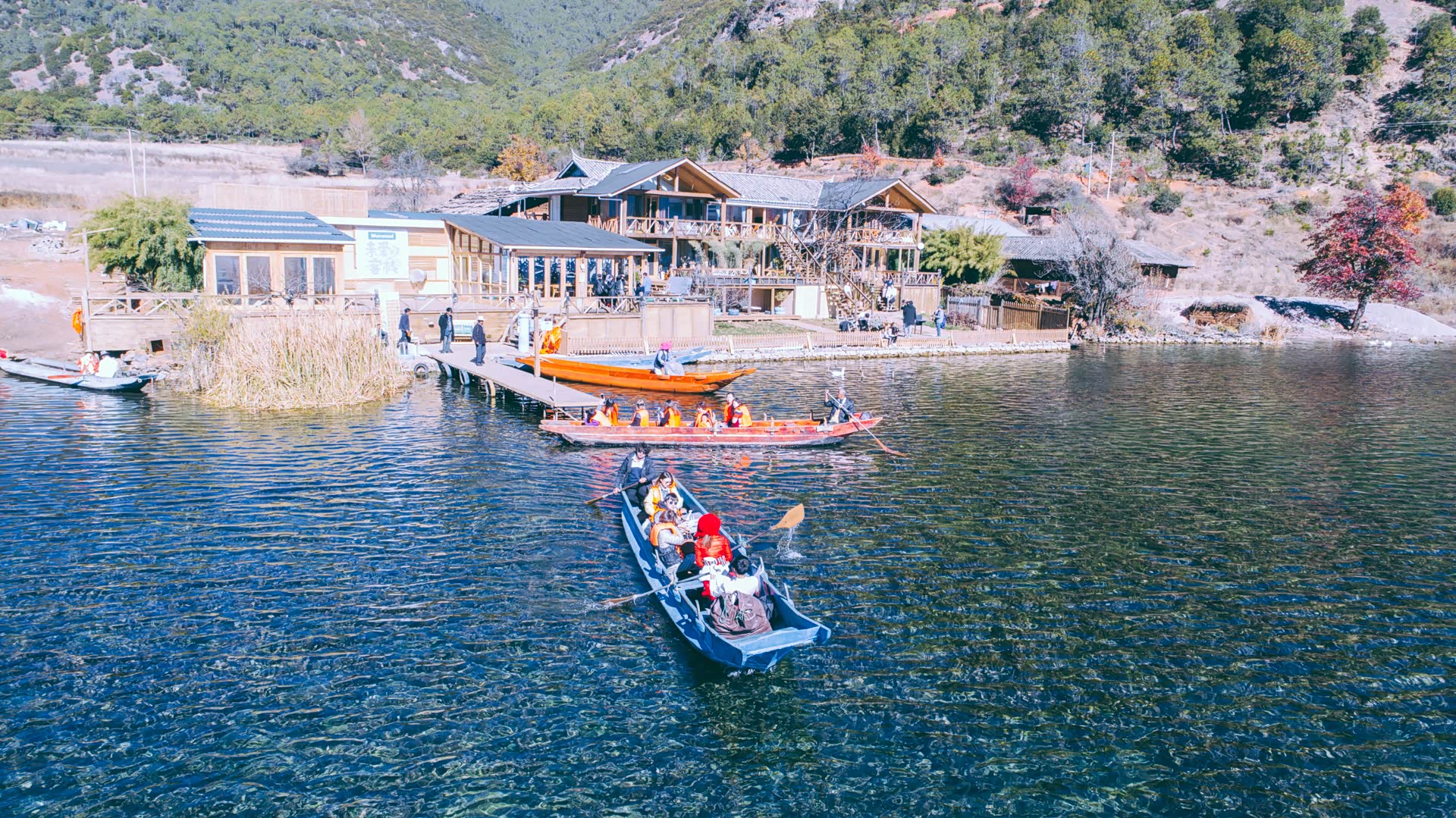 聊着天,船很快就划到了亲爱的客栈。如今这个泸沽湖边的超级网红,每天都吸引着一船又一船游客前来打卡观摩。