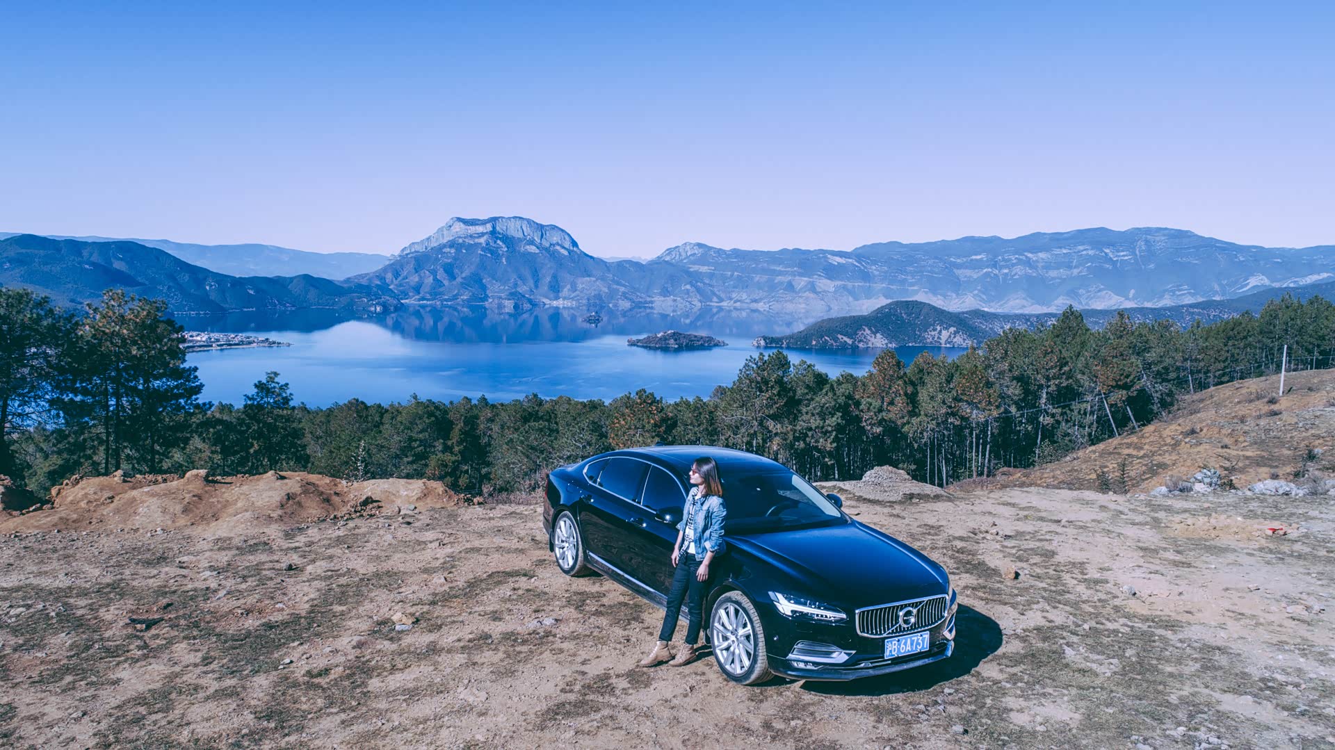 过了丽宁公路再转到宁泸公路,继续行驶约80公里,转过一个弯道,隐约透过小树林,看到一片湛蓝色湖面跃入眼睛。那当然就是泸沽湖。