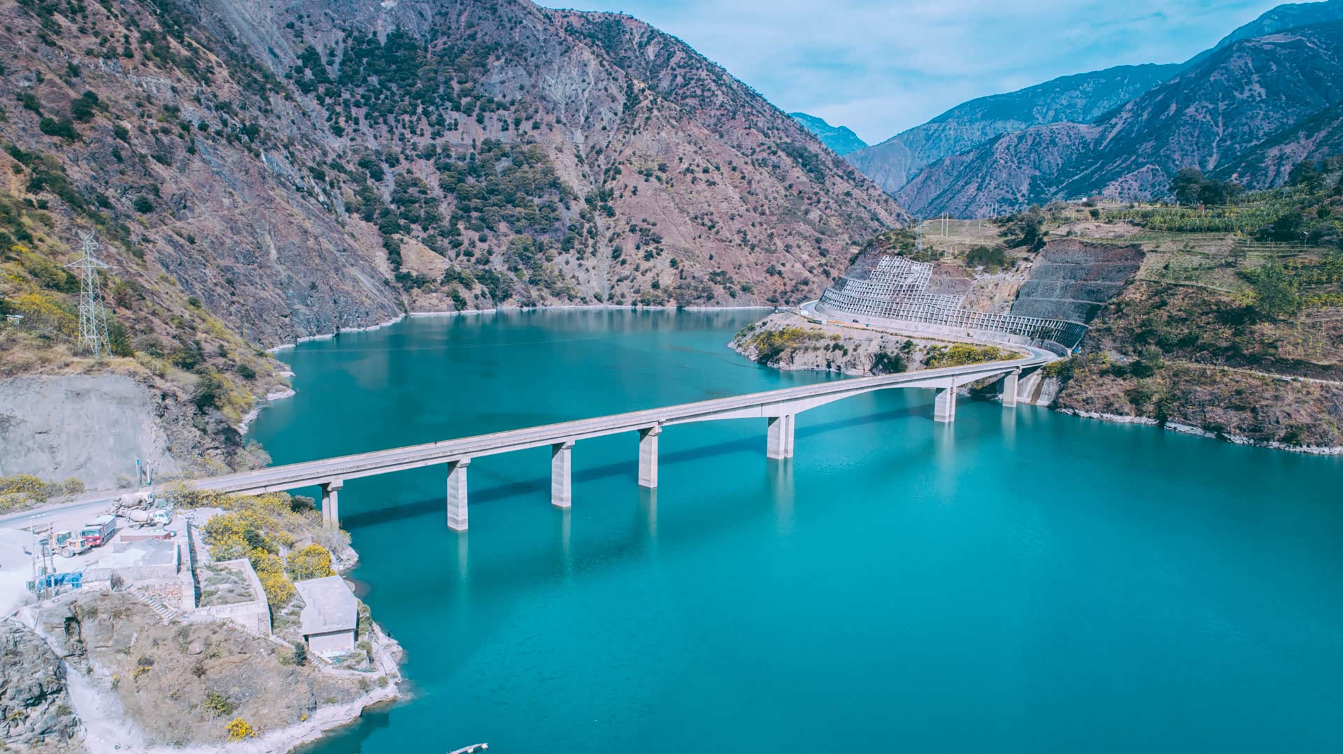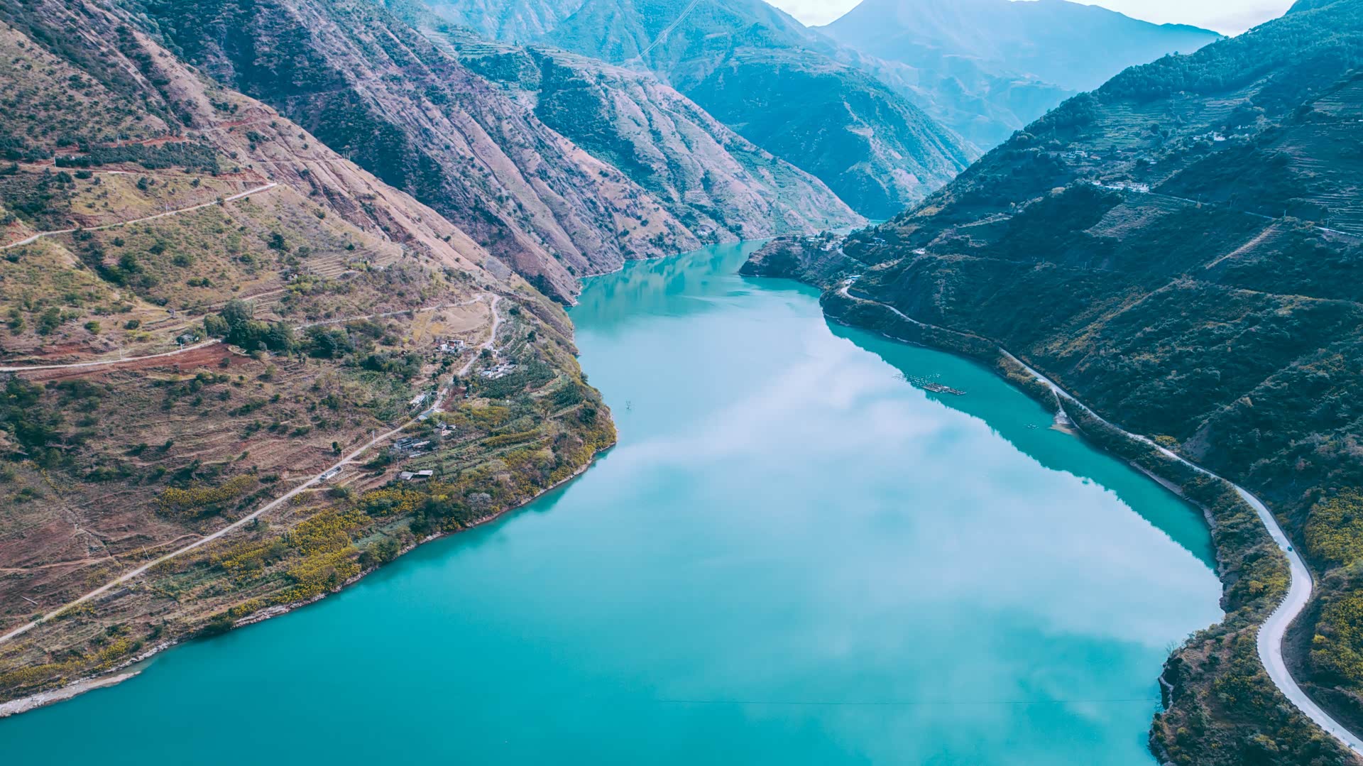 不过即使走新丽宁公路,依旧有很多美景可寻。过了十八弯观景台没多远,丽宁公路有一段紧贴着金沙江而建,右侧金沙江如同一条翠绿的丝带蜿蜒山谷间,颜色美到不真实。