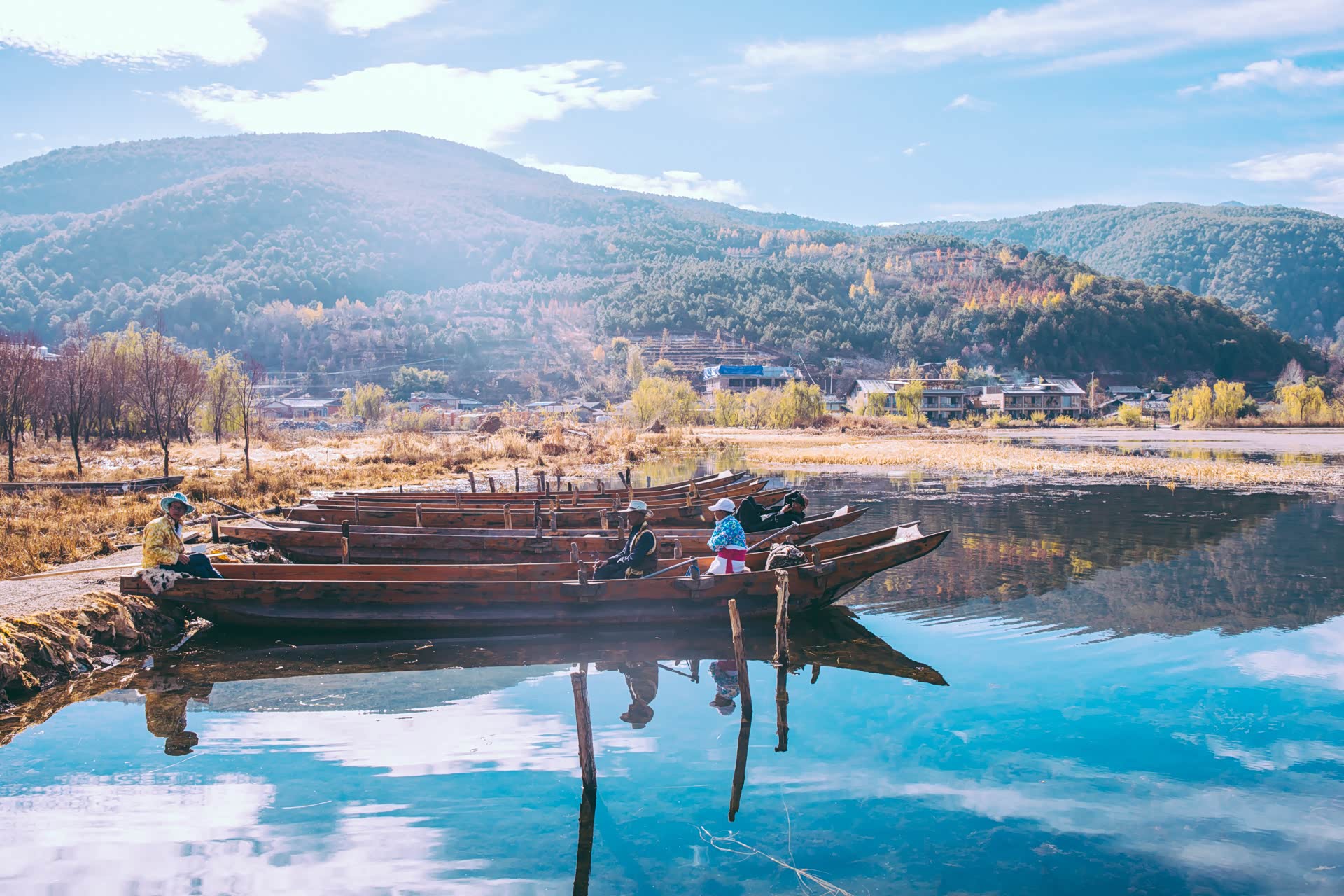 “走完婚”,我们继续环湖之旅。泸沽湖边有很多亲水码头,每一个码头边都停靠着许多小木船,这些就是去往湖面的工具了。码头和码头之间分距离远近收费不同,只不过现在这段时间已经过了泸沽湖旺季(旺季8月-10月),大部分木船都悠闲停靠在码头,反倒成就了另一番风情。