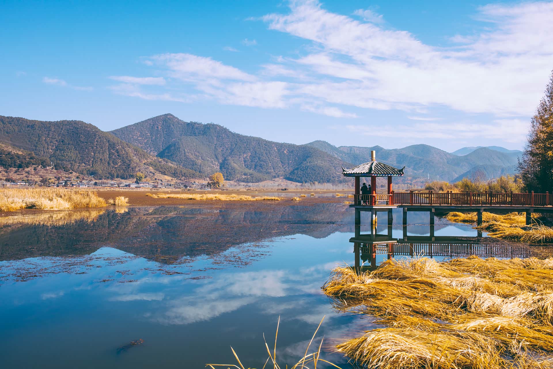 从酒店出发,通常推荐逆时针环湖。开出去十几分钟,就到达了草海和走婚桥。据说夏天水草丰茂时,缤纷鲜花点缀在大片碧绿色中,非常好看。但这个季节,草都枯黄了,遥望时有种丰收的感觉,但拍照出来就差了点意思。