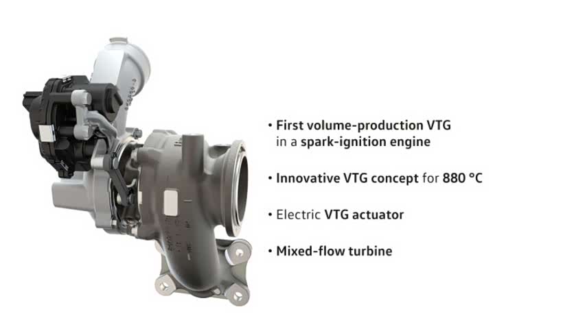 VTG涡轮增压器则是通过涡轮内部的可变废气导流叶片改变涡轮排气侧横切面积,从而改变涡轮增压器的工作特性。带来的好处便是在发动机低转速的情况下能够提升低扭,减小涡轮迟滞,而在高转速时又能提升增压值,提升发动机动力。当然在EA211 EVO发动机上面,涡轮内的废气导流叶片能够实现涡轮入口横切面积的无级调节,从而根据发动机的转速和工况设定最为合适的横切面积,实现最佳效率。