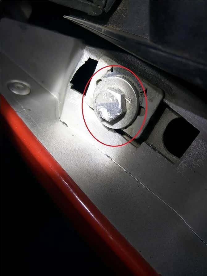 右侧前叶子板螺丝有很明显的拆卸后喷漆的痕迹,说明翼子板拆卸过。