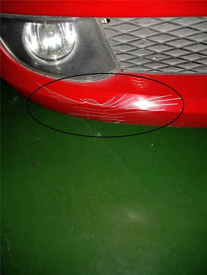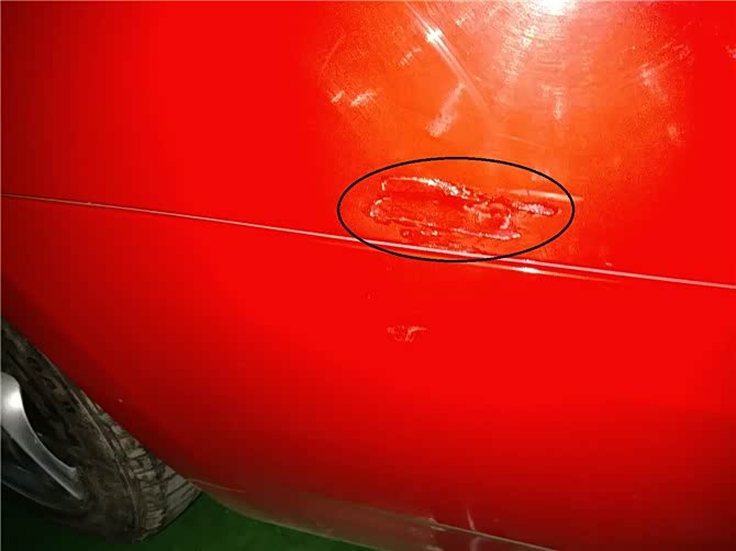 上图中标注处为左后翼子板的剐蹭,幸亏贴有膜,未伤到底漆。