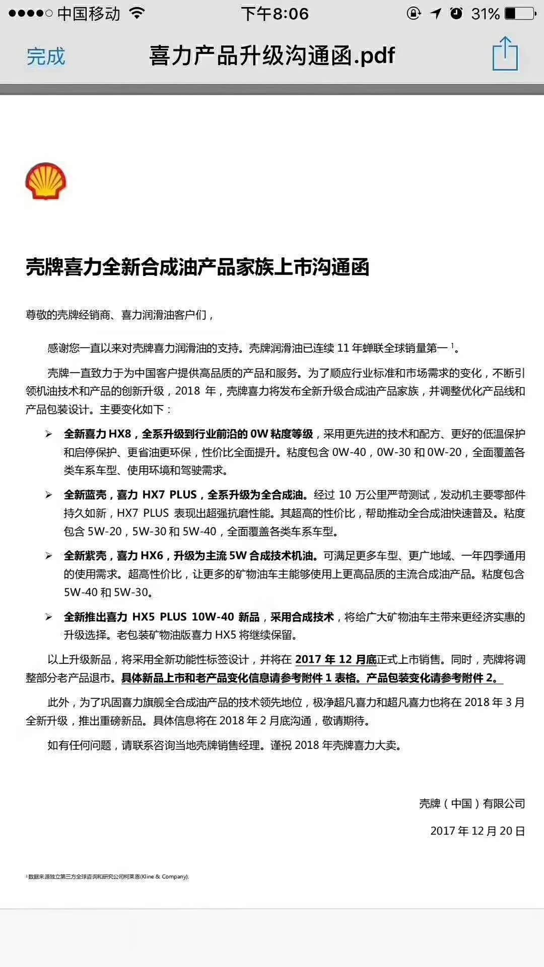 据可靠消息,传说中的紫壳已经悄悄上市。此次上市的紫色的喜力HX6是将之前的黄壳半合成的HX6进行了进一步的升级,之前很多用户对HX6和HX5都是黄色的包装产生了质疑,现在壳牌终于把HX6的包装换成了紫色,然而油品升级成半合成高端机油,这样有效的区别了与HX5黄壳矿物油。这次壳牌不仅将HX6升级成了紫色包装,并且对HX5黄壳、HX7蓝壳、HX8灰壳都进行了技术升级,提高了产品的竞争力。HX5 PLUS系列将升级成为合成技术的半合成低端机油,HX7 PLUS将升级成为全合成的低端油,然而车友们最爱的灰壳超凡喜力系列的机油将于3月份上市,上市后的超凡喜力系列将全系使用天然气合成技术的基础油,性能则会更加优秀。未来壳牌机油的格局是HX5黄壳矿物油<HX5 PLUS黄壳半合成机油<HX6紫壳半合成机油<HX7 PLUS蓝壳全合成机油<HX8灰壳全合成机油<超凡喜力灰壳全合成PURE PLUS天然气转换基础油的全合成机油。