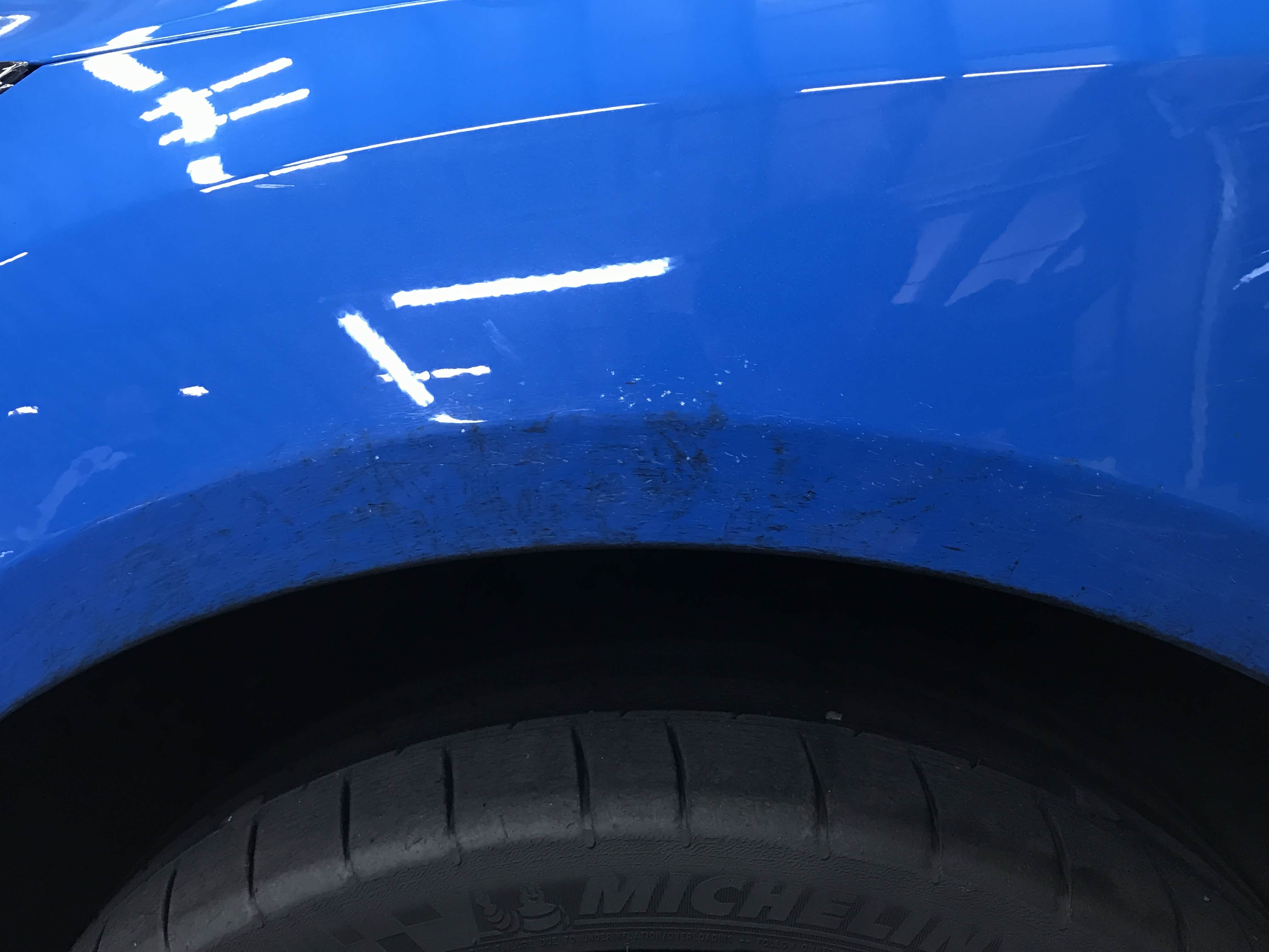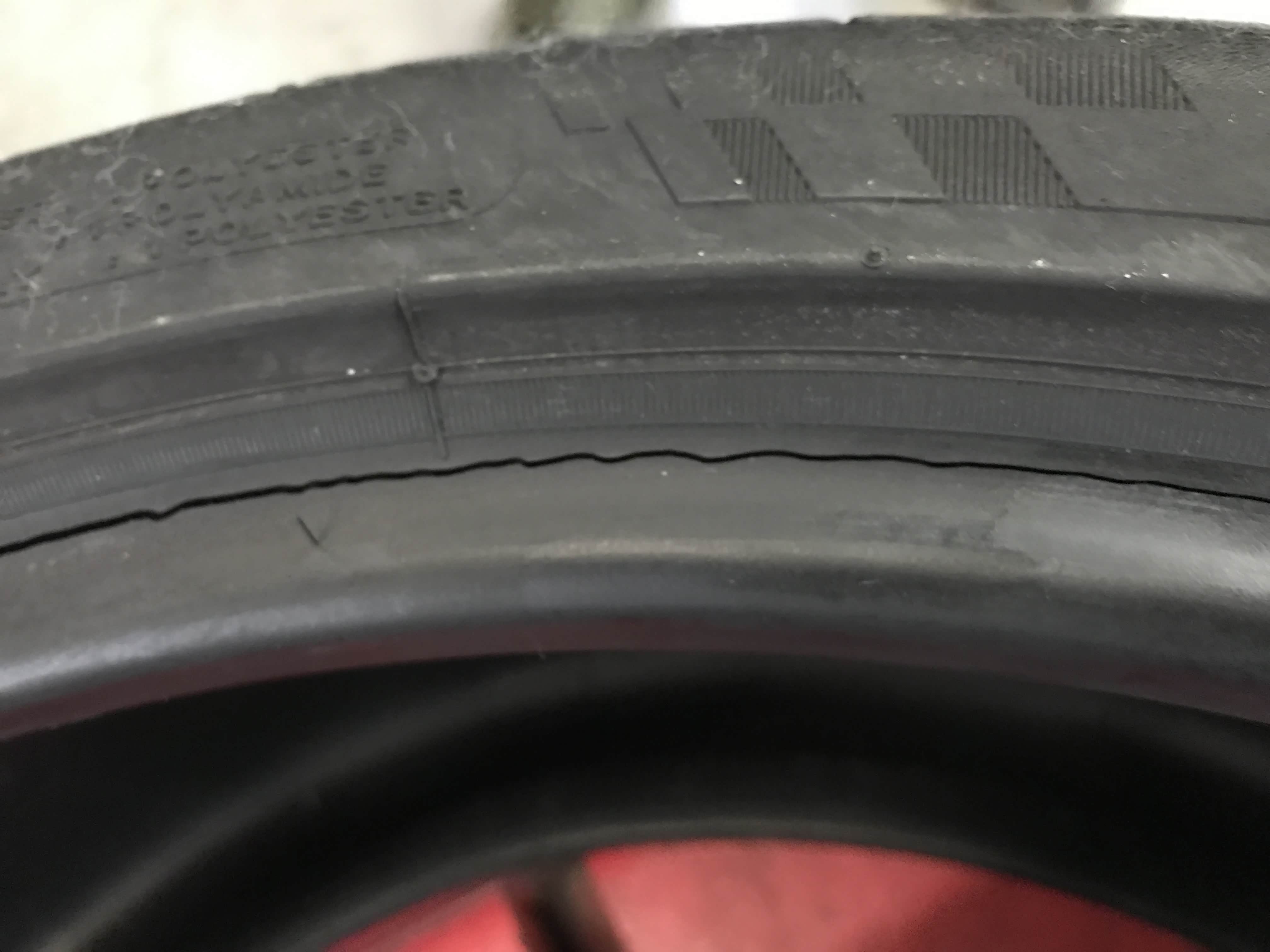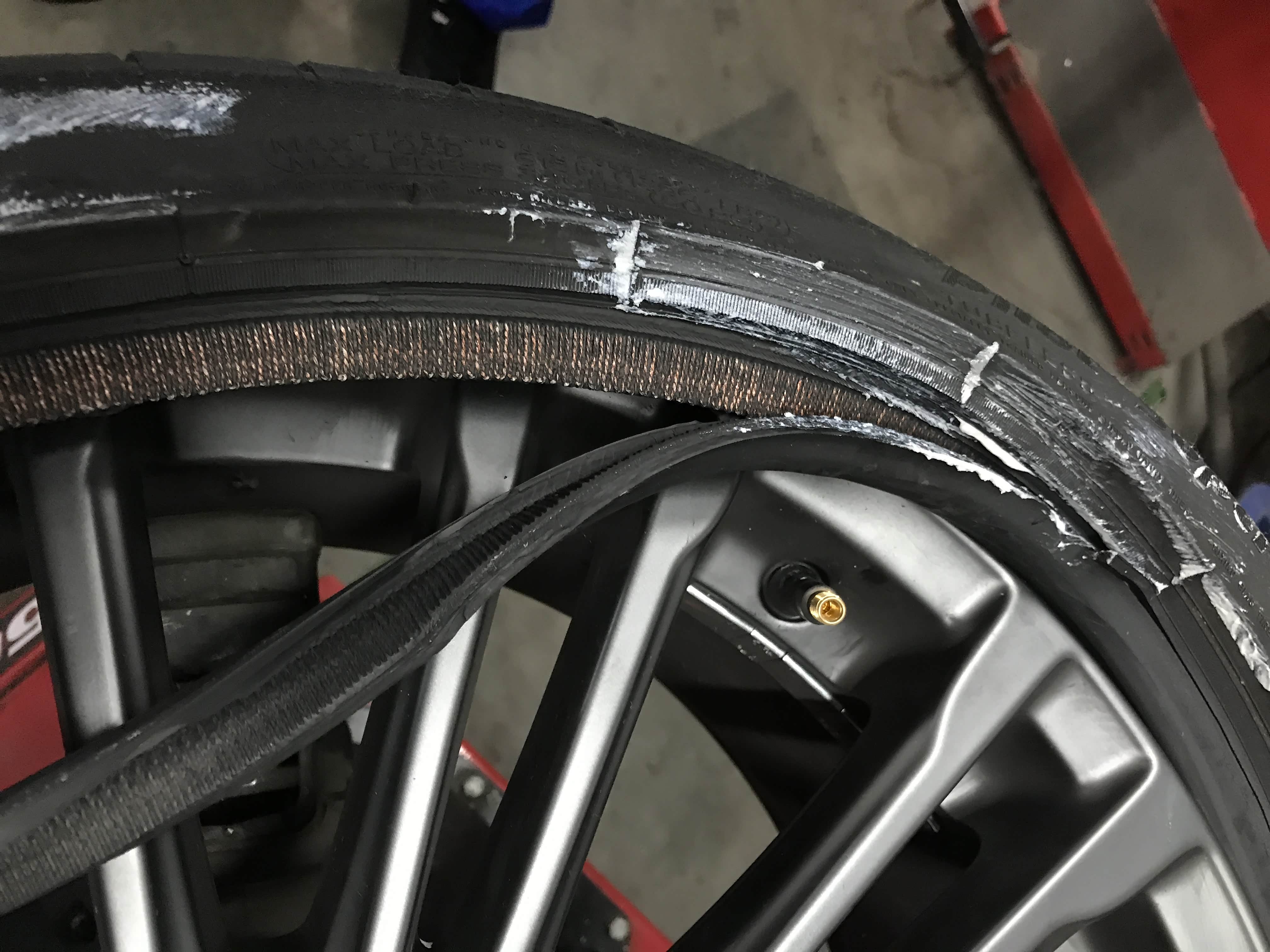 下面这几张图是我提前用上PS4 S的直接原因。通常我的习惯是为trackday玩具多准备一套轮胎,这套PSS是在2016年年底购买的。在安装PS4 S的三天前,我直接换上这套新胎去上赛跑trackday。在第一节进行到一半的时候我开始听到奇怪的异响,当我回到维修站,左前翼子板已经毁了,而左前胎内竟然窜出了一条诡异的胶条。这条轮胎被拆下后显示胎壁和轮胎接触的部分已经撕裂。