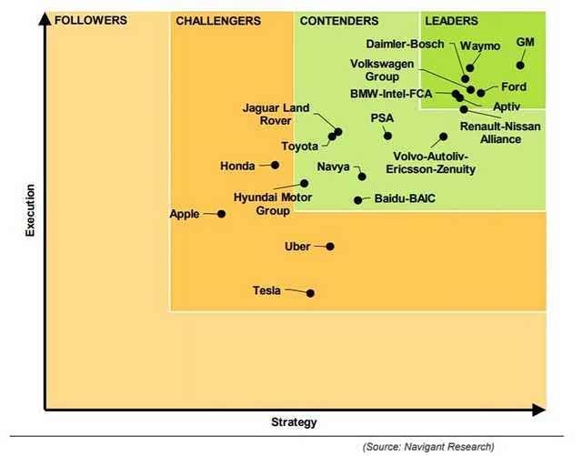 【自动驾驶企业排名 苹果特斯拉双双垫底】美国市场研究机构Navigant Research发布了最新无人驾驶技术排行榜,该榜单从公司愿景、市场发展策略、合作伙伴、生产策略、技术、营销、产品、产能、产品质量及可靠性、产品组合和长期投入度等十个维度去综合评价,选出全球自动驾驶领域最具竞争力的企业。从这份榜单中可以看出,目前无人驾驶领域已经发生翻天覆地变化,通用汽车和谷歌母公司旗下的Waymo分别位列第一名和第二名,传统车企已经迎头赶上,特斯拉和苹果双双垫底。中国的百度公司则因为早前发布的“阿波罗计划”,从榜单垫底位置攀升至竞争者行列。