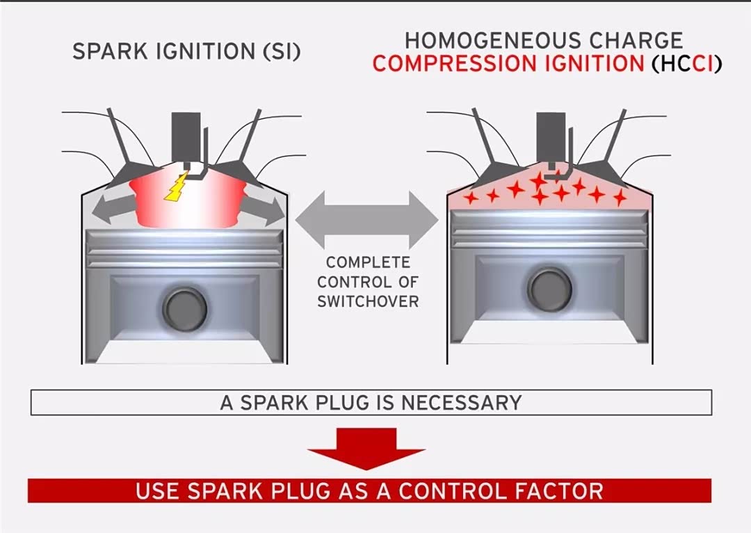 虽然实现这项技术的过程很复杂,不过理解起来并不难,HCCI发动机本来是不需要火花塞就能运作的,马自达加入了可配合HCCI发动机动态进行精确控制的火花塞后,HCCI发动机在低转速区间无法稳定运转的缺陷就被成功回避了。