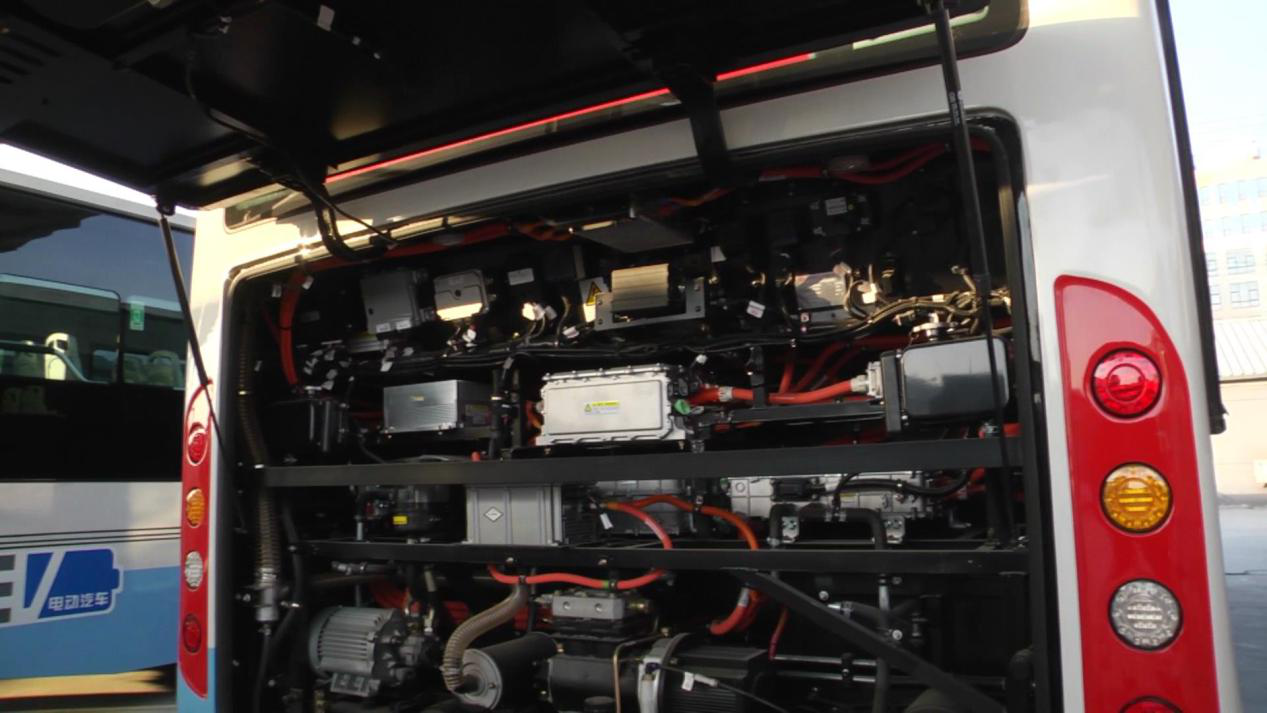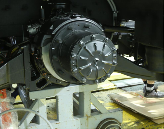 电动客车动力系统最为关键的一部分就在于电机,比亚迪K8采用的是功率为90kW(全车有两个90kW的电机,两个电机相加总功率就是180kW,折合成马力就是240)的交流永磁同步轮边电机,我们可以笼统将这种新的电机放置技术理解为传统的轮边减速器与电机的结合。轮边电机的特点在于车辆转弯时电子差速器可以实时控制车轮转速,相比普通的差速器轮边电机具有精度高传动比大的特性,取消了机械式差速器减轻了车身重量相率并且降低机械噪音。这种设计减少了动力传动部分的安置,对车身结构和重量都起到了非常大的优化,最重要的是为实现低地板提供了便利。